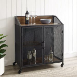 Walker Edison Industrial Metal Mesh 2 Door Bar Cabinet, Dark Walnut