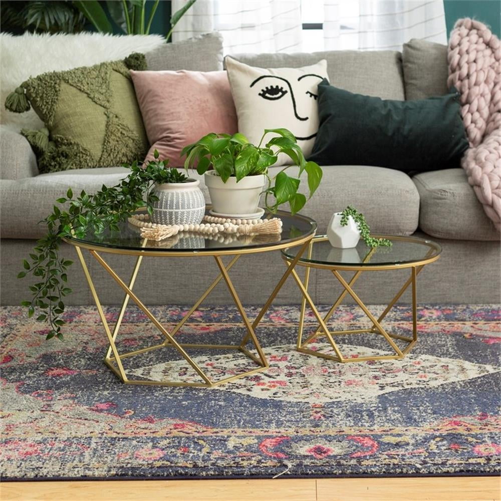 Walker Edison Round Glass Top Nesting Coffee Table Set with Gold Base