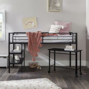 Walker Edison Twin Metal Loft Bed with Desk and Shelving, Black