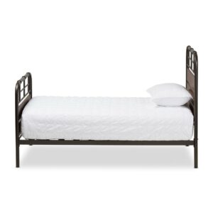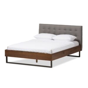 Baxton Studio Mitchell Rustic Industrial Walnut Wood Grey Fabric Dark Bronze Metal Queen Size Platform Bed