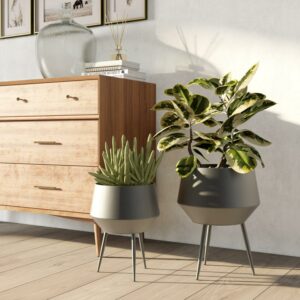 $57.34The Raya White Mid-Century Modern Planter with Tall Metal Base is a durable and elegant plant pot with stand. This all metal pot creates depth and style in your room while providing a functional pot for a variety of indoor plants. The Raya planter has smooth curves emphasizing the minimal aesthetic of mid-century modern decor. The planter sits on a tall metal base, creating the illusion of more space in your room. The round planter can accommodate medium to large-sized plants, while the touch of gold in the tall metal plant stand adds elegance to your decor.