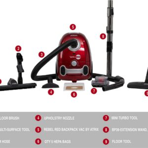 Atrix VACBP1 Ergonomic Backpack Vacuum Cleaner – 8-Quart HEPA Filter, 1400W Portable Small Vacuum for Multi-Use – Includes Attachments: 6′ Hose, Blower Nozzles, Wand, Brushes