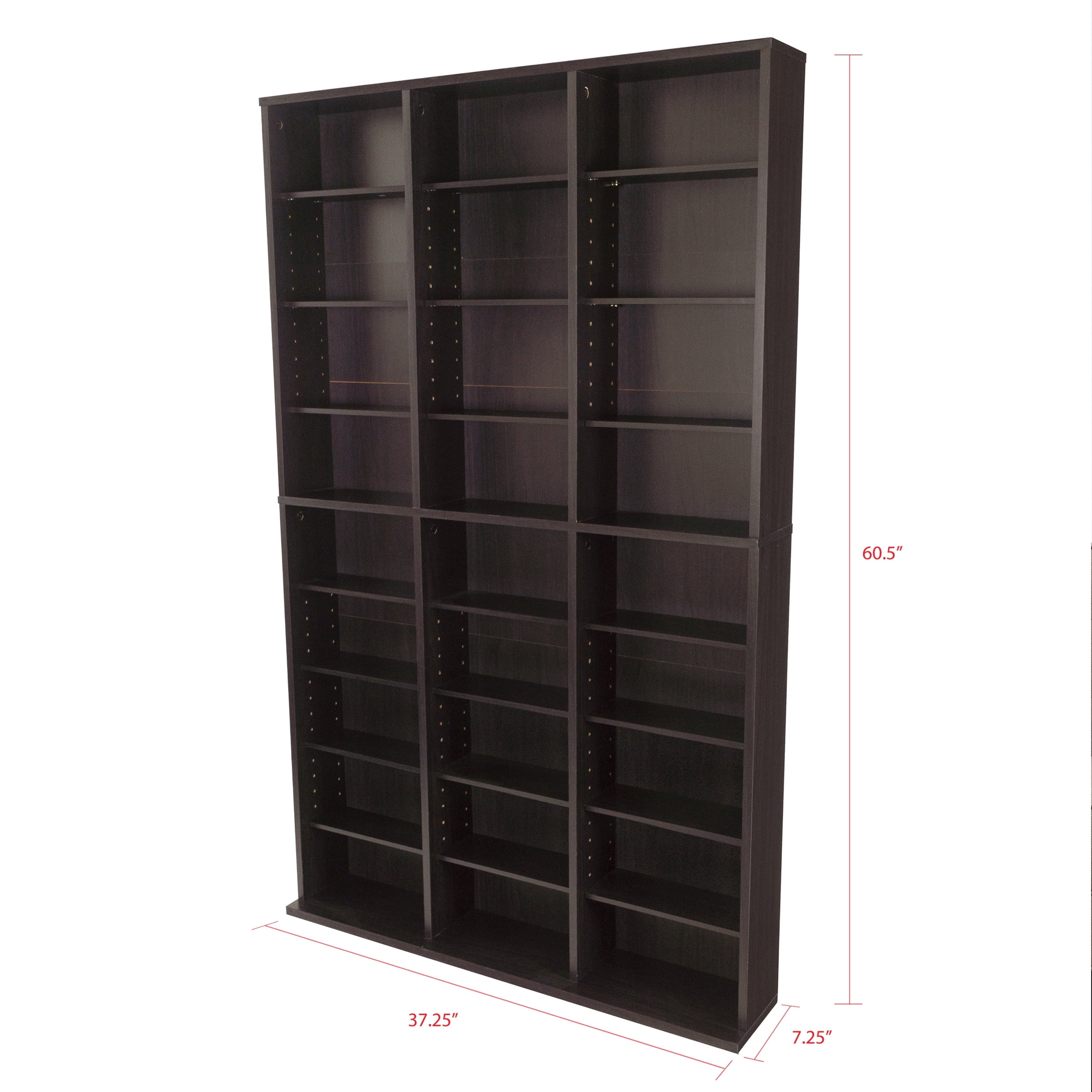 $96.54You’ve got a lot of CDs, DVDs, Blu-Rays, games and books; you want to show them off, without overwhelming your living space. Impressive height and expansive width, yet with slender lines – Oskar let’s you keep a feeling of lightness in your decor while displaying even a hefty media collection. Rich espresso color lends a coastal feel to a handsome design that will shine anywhere from bedroom, to den, to home office. Features: Multimedia storage for 414 Blu-rays, 360 DVDs, 756 CDs. Large collection media storage cabinet Adjustable shelves for better media organization Extended base for stability Durable frame Wall anchor kit included Specifications: Included: Hardware Number of Shelves: 9-Tiers; 3-Columns
