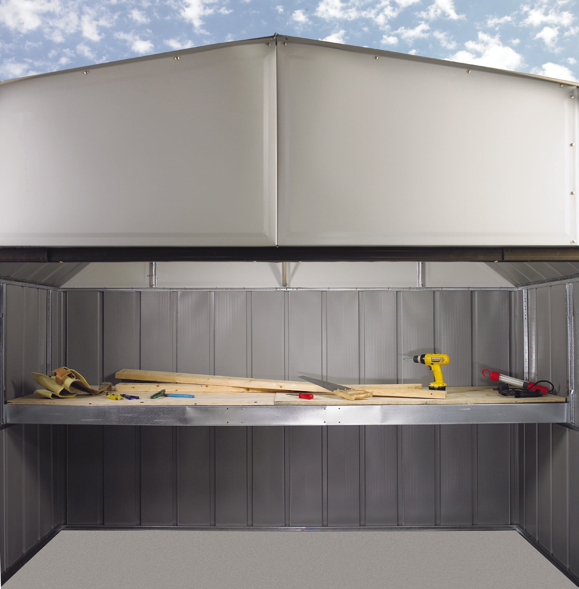 $75.67Original price was: $75.67.$61.42Current price is: $61.42.This versatile, wide shelf frame can be installed at counter height as a handy Workbench, or installed closer to the roof, making a great storage attic for 10 ft. wide Arrow buildings. Only compatible with 10 ft. wide Arrow Storage sheds and garages. This is unit is not compatible with EZEE Shed models.Adjustable to any of five heights for an attic or workbench. Fits any 10 ft. wide Arrow shed. Holds up to 250 lbs of evenly distributed weight. Shelving material is NOT INCLUDED. HDG steel® TECHNOLOGY – steel undergoes a hot dipped galvanization process providing superior corrosion resistance