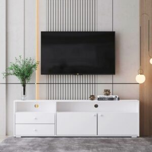 Aukfa TV Stand for 70 inch TV with Rattan Doors & Storage Drawer, Sideboard Cabinet,White