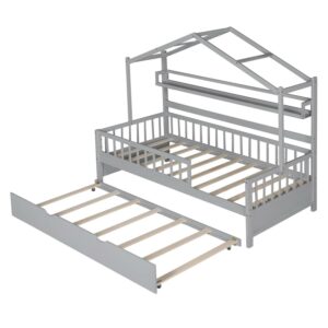 Aukfa Trundle Bed with Roof and Shelves, Wooden Twin House Bed with Trundle – Gray