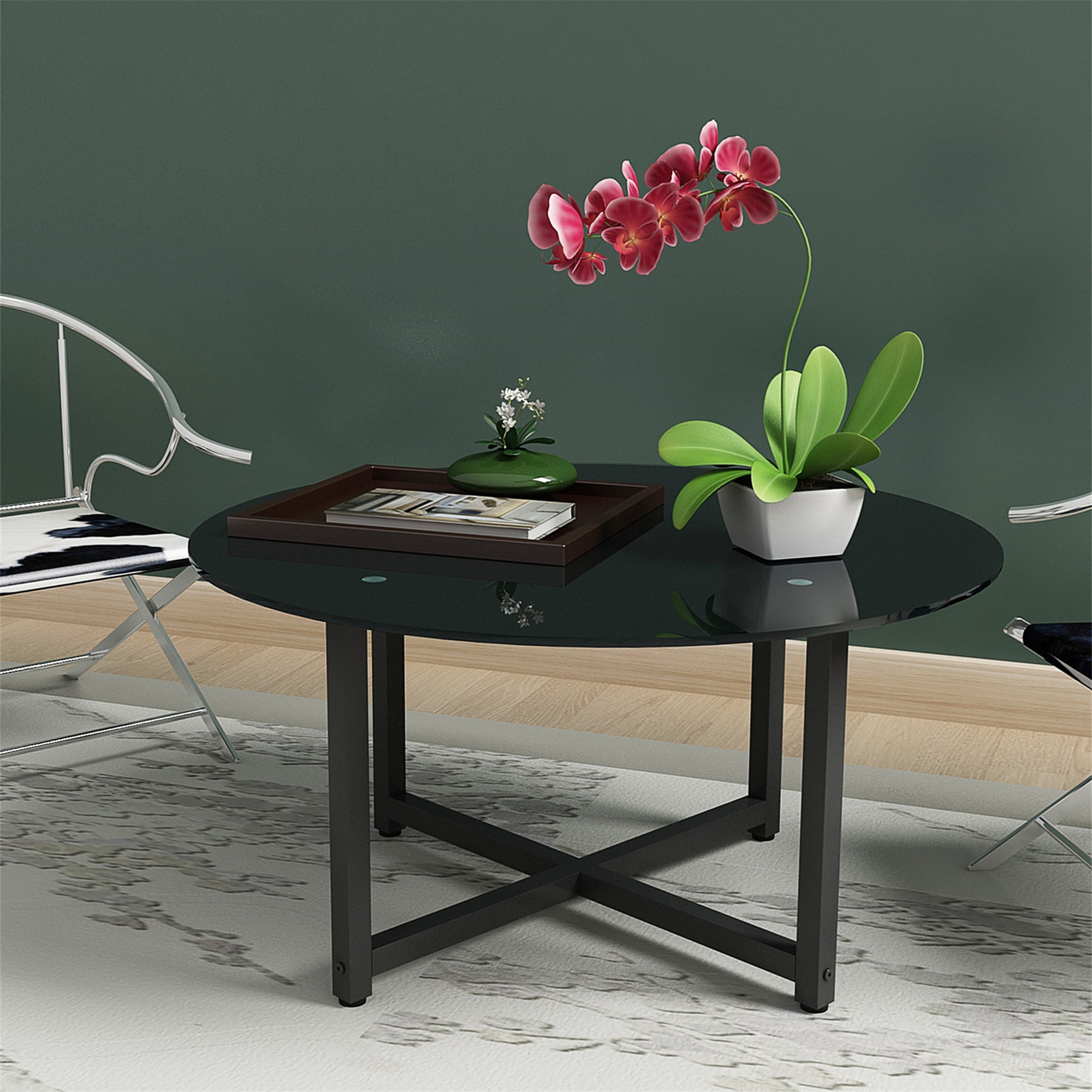 Aukfa Round Tempered Glass Coffee Table Metal Tube Legs End Table for Living Room, Black