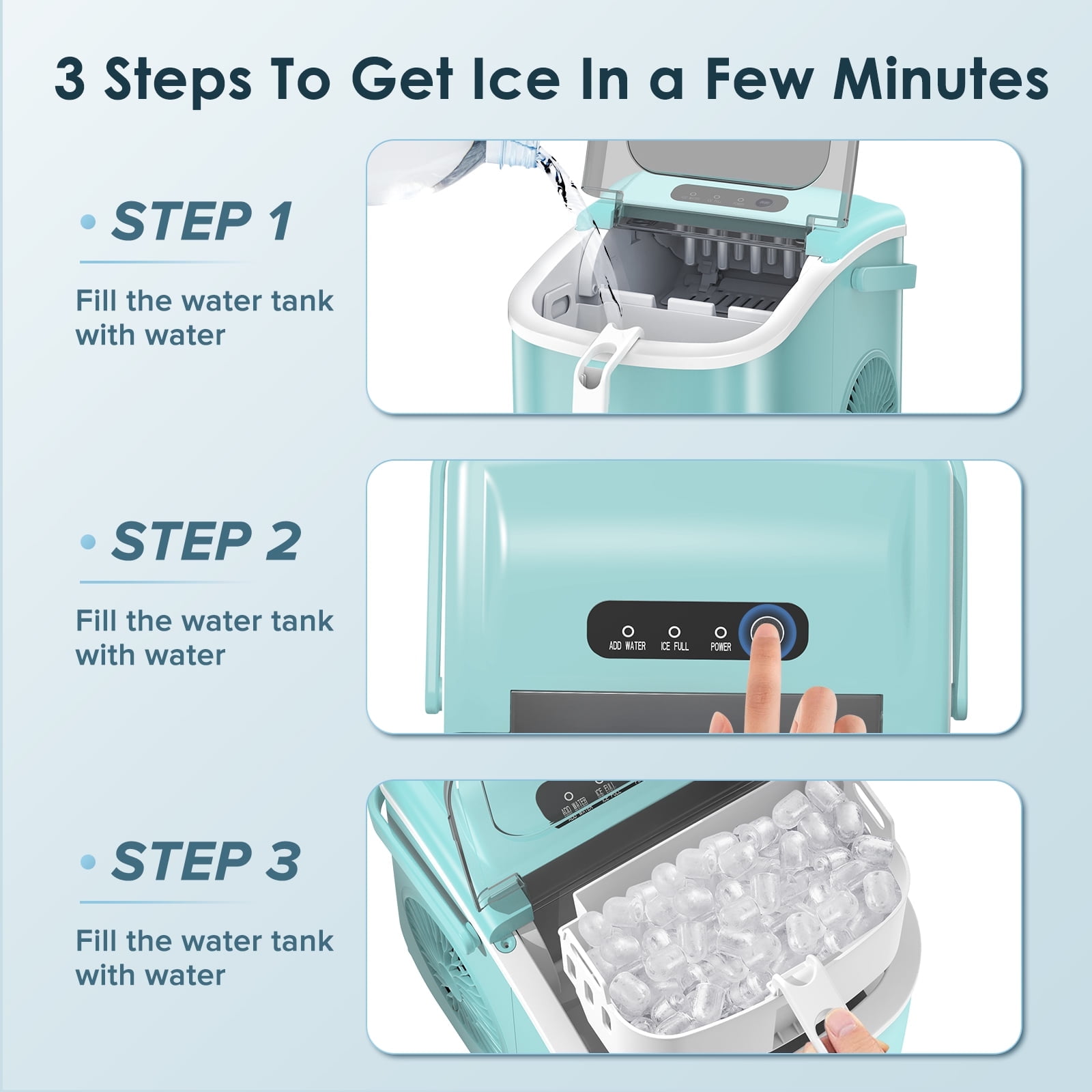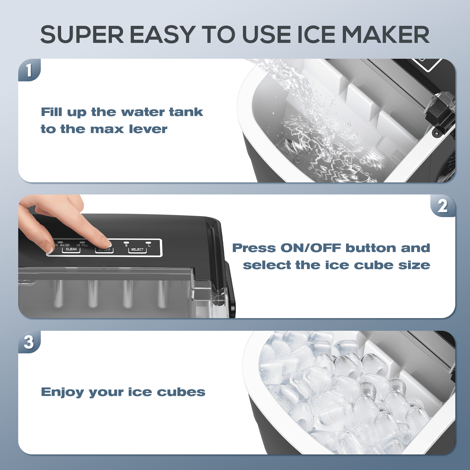 $94.59Original price was: $94.59.$42.98Current price is: $42.98.Auseo Ice Maker for Countertop, Fast ice Making in 6-13 mins get 9 ice cubes. SELF-CLEANING FUNCTION: Ice maker countertop with self-cleaning function, just press ON/OFF button for 5s to start self-cleaning mode, which allows you not to spend time cleaning it basically. Please Note:The ice cubes will melt if they stay in the machine for a long time, it’s suggested to hold the ice in an ice bag when the machine is done making ice and store it in the refrigerator.