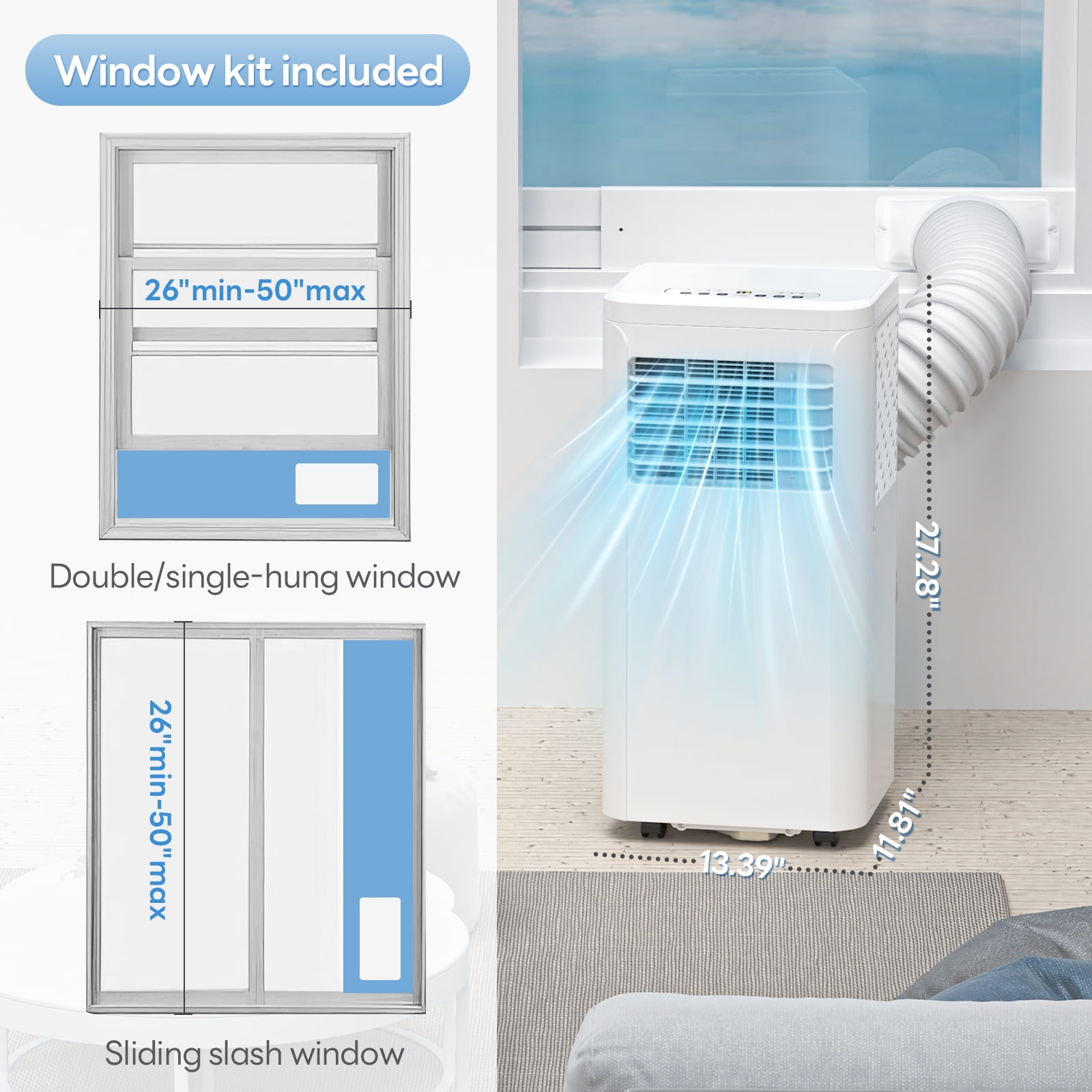 $283.79Original price was: $283.79.$154.79Current price is: $154.79.Auseo 4-in-1 mobile air conditioner is equipped with three modes: cooling, dehumidification, fan and sleep. The two wind speeds can be adjusted according to your own situation. Built-in 24-hour timer and sleep mode, low running noise, saving energy and money, and providing a good sleep atmosphere. Auseo 10,000 BTU ASHRAE portable air conditioner can ventilate and circulate air in your room, making your space more comfortable and fresh, and the intelligent and simple operation will give you a better experience. Packing List: User Manual*1 Remote Control*1 Battery*2 Connector*1 Exhaust Hose*1 Adapter*1 Window Kits*1 Window Kits Screw*1 Flat Screws*2