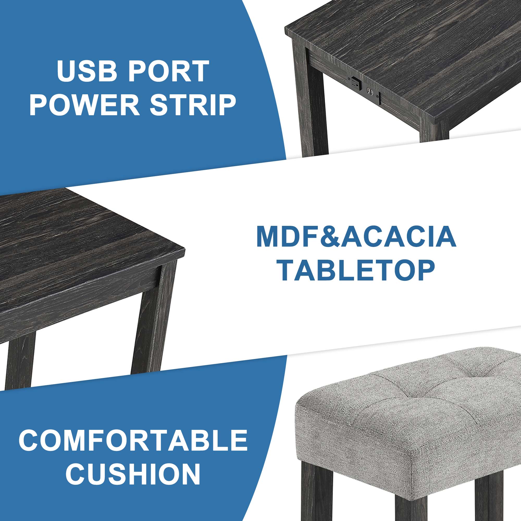 Aukfa Wood Kitchen Table Set,Dining Table Set of 4 with 3 Stools and Power Outlet,Black