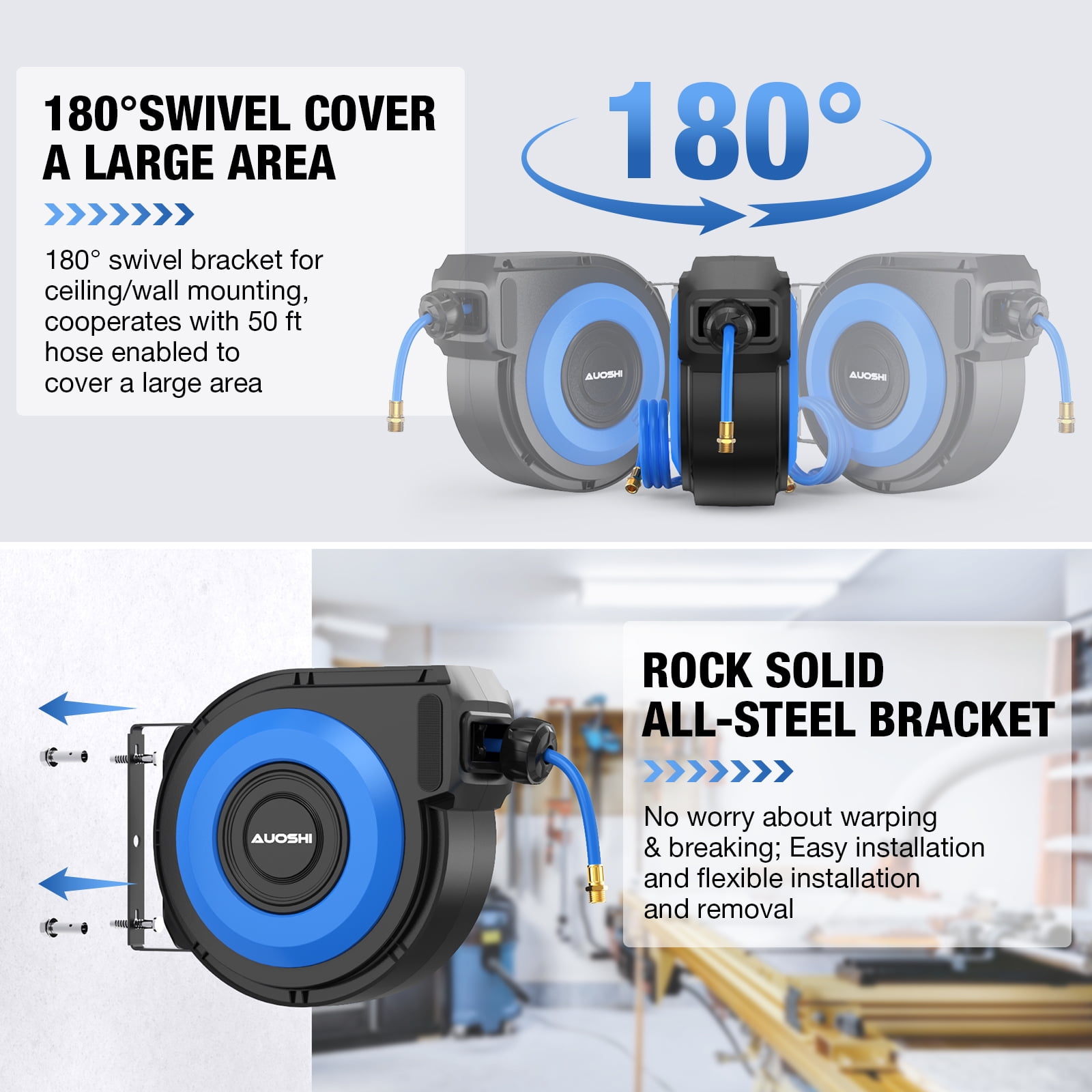 AUOSHI Retractable Air Hose Reel Air Compressor Hose Reel Automatic Rewind with 3/8 IN x 50 FT Hybrid Air Hose 5 ft Lead in Max 300PSI Wall Mount Enclosed Air Reel, 180° Swivel Mount