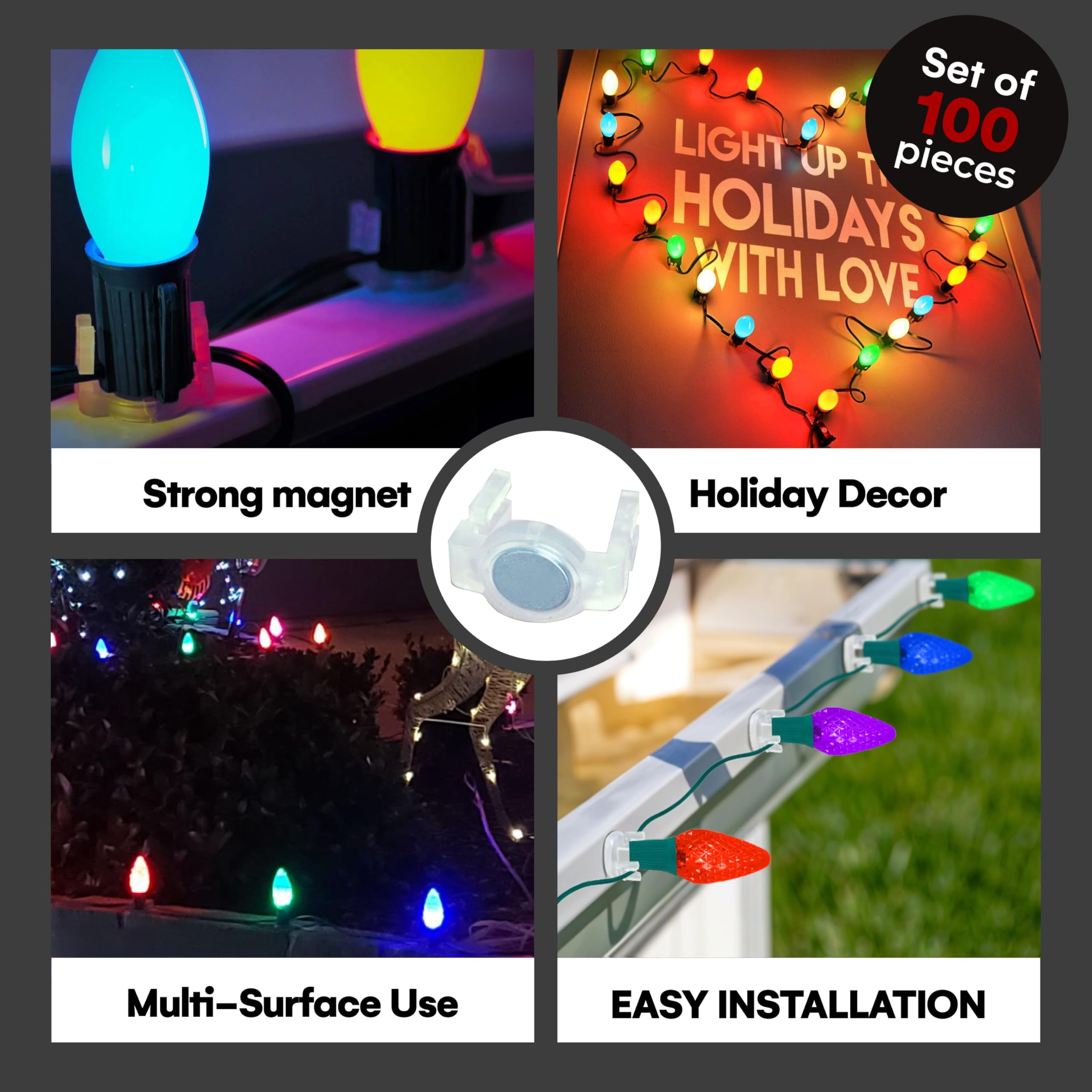 $60.19Plenty for decorating your entire house! Extra Strong Magnet Holds C9 Socket and Bulb Vertically or Horizontally. Perfect Festive Lighting- great for Christmas, Halloween. Draw attention to your house during the holidays by securely attaching light bulbs to any magnetic metal surfaces. Great on metal gutters, these extra large clips are clear and cannot be seen as easily as other products. Holds Up In All Weather Strong magnetic connection and is durable to keep up all year long. Clips are easy and quick to install, for a neat, simple and hassle-free solution to holiday light decorating. These clips are for traditional C9 sockets, but the clips are strong enough that they can be used with String and Glove lights.