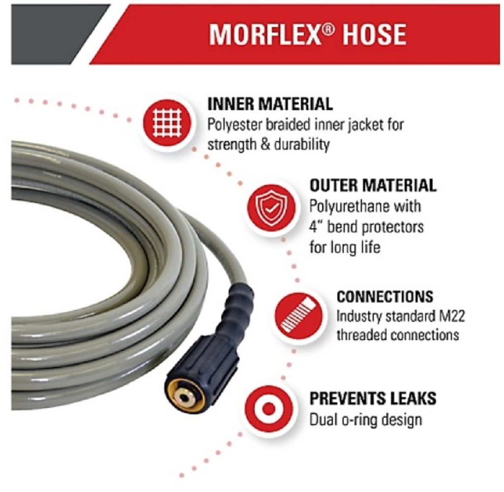 $64.96SIMPSON’s MorFlex technology is used for high flexibility and kink resistance. It has a lightweight polyester braid for easy handling and a polyurethane outer jacket that is non-marring and abrasion-resistant. MorFlex hoses are equipped with threaded M22 connections with a dual o-ring design to fit most gas and electric pressure washers with standard M22 connections.