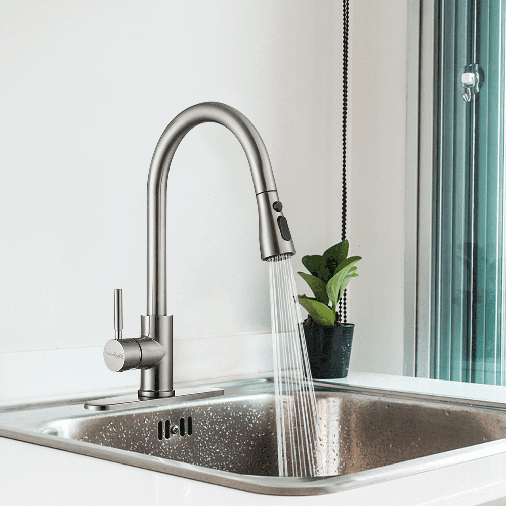 $64.49This SkyGenius Single Handle Pulldown Kitchen Faucet is really nice and modern looking, it will be an upgrade of your kitchen sink. This Pull-Down Faucet is made of SUS304-2B food grade stainless steel and durable brass, quality ceramic valve core, Lead free and eco-friendly. It is finished with brushed nickel, 1 or 3-hole installation (Deck plate not included). It is a single handle design faucet, with high arch 360-degree swivel nozzle which can cover your whole sink, easy to control. There are two stream modes for choose: soft aerated stream and powerful spray-rinsing. The SkyGenius kitchen faucet comes with the installed water supply lines (32 inches), and all tools are included in the package, DIY yourself without a plumber. Each kitchen faucet has passed the hydraulic test before being sold, make sure no leak.