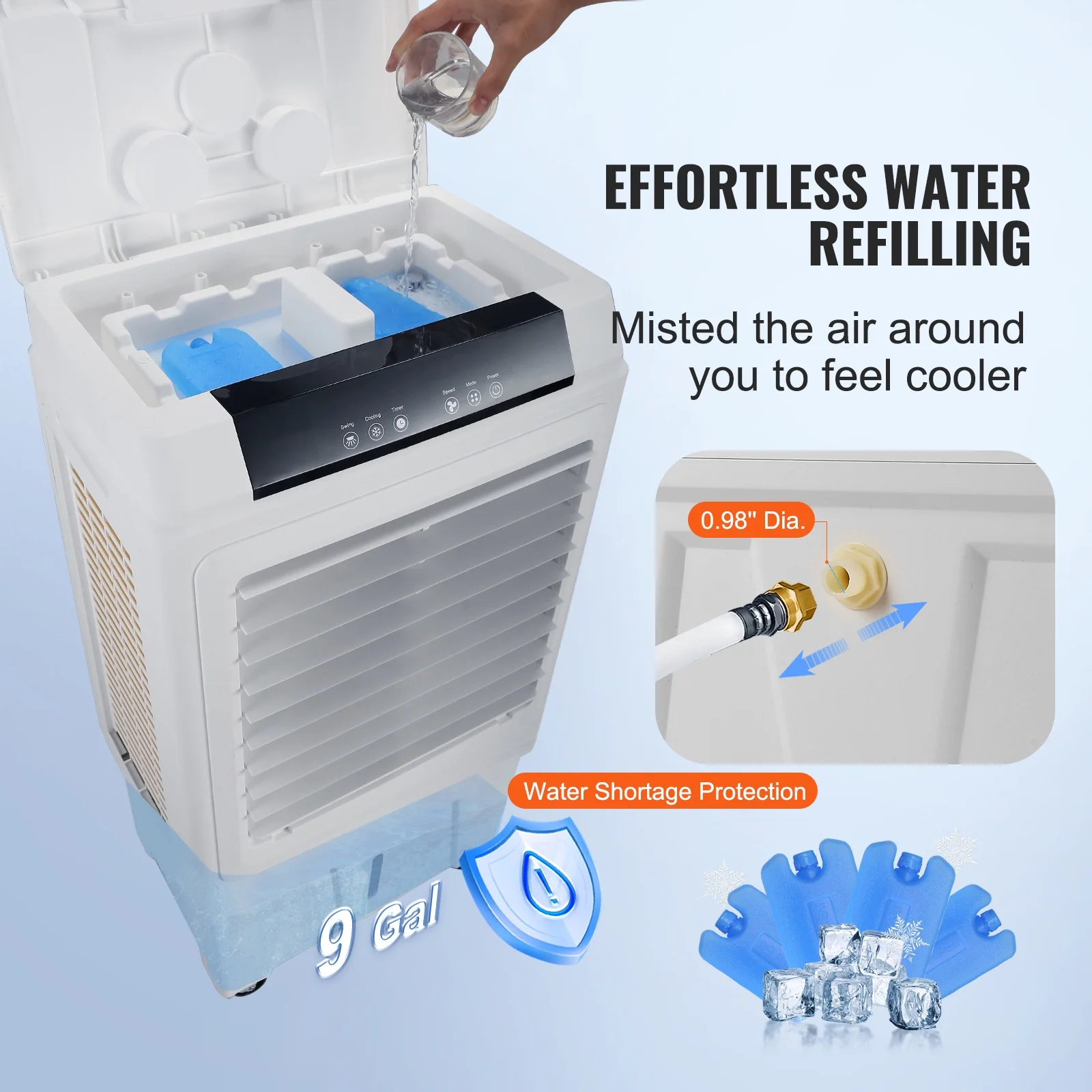 $157.37Product Description SKYSHALO Evaporative Coolers Looking for a way to beat the heat? Our swamp coolers are environmentally friendly and affordable solutions! Different from air conditioner, it efficiently uses water to cool the air and doesn’t require installation. Its functions include blowing, cooling, and humidifying, allowing it to make a difference during hot and dry weather! Continuous Fill The fan also features water shortage protection so you can watch the water level directly. The unit’s 9-gallon water tank can be connected to a hose for automatic refilling. Carry with Ease The unit is easy to move and place anywhere, including up and down stairs, indoors and outdoors, and it has built-in carrying handles on both sides. Premium Swivel Wheels Easily move to any room in your home, garage, patio or workshop with four lockable casters. Effortless Top-refilling There are no hoses to attach and no bending required.When you fill the water from the top, you can place 4 ice packs on the tray, allowing the cooler to release even colder air. Three-sided Cooling Pads The pads can be easily removed and dried for storage when not in use.This unit has 1.8” thickened cooling pads on three sides that absorb heat from hot air and convert it into cold air and water vapor, resulting in quick cooling. Widely Used It’s perfect for places like barns, patios, gardens, porches, and even outdoor gatherings like BBQ parties and family lunches.This fan is easy to use and requires no installation. It can be used both indoors and outdoors, making it suitable for both home and commercial use. Specifications Item Model Number: JH-390Y Air Flow: 3100 CFM Adjustable Left and Right Swing: 72° Up and Down Angle: 135° Tank Capacity: 9 Gal / 34 L Max. Room Size: 950 Sq.ft / 88 ? Timer Function: 12 H Cooling Pads Thickness: 1.18” / 35 mm Adapter Size: 0.98” / 25 mm Power: 120 W, 120 V / 60 Hz Power Cord: 8 ft / 2.4 m Weight: 23.9 lbs / 10.83 kg Noise: ≤60 db Item Size (L x W x H): 18.9 x 13.2 x 38.4 in / 480 x 335 x 975 mm Package Content 1 x Evaporative Cooler 4 x Ice Packs 1 x Brass Adapter 3 x Cooling Pads