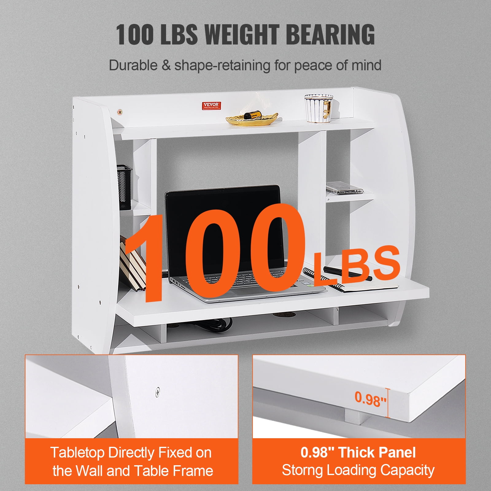 $78.71Product Description Max your wall space while provid spacious storage! This high-quality wall-mounted floating desk serves as more than just an office desk. It’s also great as a study, dining, or display table. With storage shelves above and below, it offers ample storage space, utilizing the shelves and cubby for partitioned storage and convenient usage. Enhanced Weight Capacity Crafted from 1.18 inch high-strength particle board, the wall-mounted floating desk ensures durability and resistance to deformation. For enhanced stability, the desktop is directly fixed to the wall and table. With more installation holes, it supports up to 100 lbs. Convenient and Practical Deisign Our floating office desk is equipped with a power socket and a 70.9 in/1.8m power cord for added convenience. Perfect for charging devices like laptops or phones while studying or working. Additionally, it includes a cable management hole for a clutter-free desktop. Strong and Durable Tabletop The tabletop is crafted from sturdy and eco-friendly particleboard, smooth surface for easy cleaning, and water, and oil resistance. Additionally, the wall desk is designed with curved corners, reducing impact and scratches during use. Easy Setup This wall mounted table comes with complete accessories, also includes an extra screw to avoid any missing parts. Simply follow the instructions provided, easy even for beginners. Versatile Wall Mount Desk This premium floating desk, measuring 32.28×15.35×23.62 inch, functions beyond an office desk; it’s versatile, suitable for studying, dining, or displaying items. The high-quality desktop makes it sturdy and durable. It also features a sleek surface for effortless cleaning and rounded corners, enhancing safety. Smooth Corners We designed to round off the sharp edges of the tabletop, reducing the risk of impact and scratches when in contact with the body. This design provides a safer and more comfortable user experience. Specifications Item Model Number: HZCD004 Product Size: 32.28×15.35×23.62 inch Board Thickness: 0.98 inch/25 mm Table Top Size: 30.87×15.35 inch Weight Capacity: 100 lbs Splice Plate: No Foldable: No Curved Corners Design: Yes Main Materials: Particleboard Product Net Weight: 33.73 lbs Package Content 1 x Wall Mounted Folding Table 1 x Set of Installation Tool & Accessories