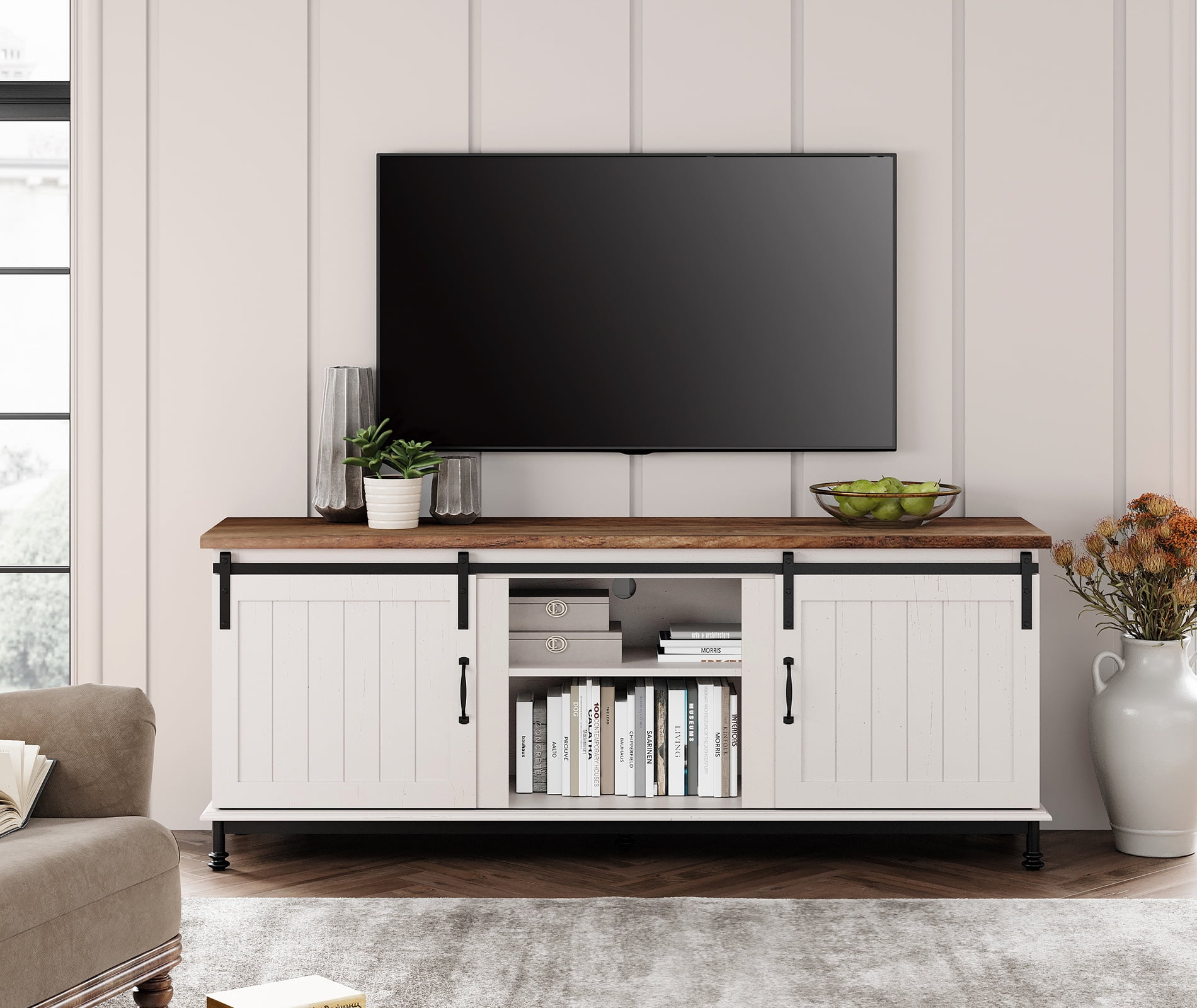 $193.50This exquisite barn door tv stand is specially designed to accommodate a 70 inch television. The standout feature of this TV cabinet is its sliding doors, elegantly designed to offer accessibility and save space. The white color adds a touch of sophistication and simplicity, effortlessly blending with any home decor. Crafted from high-quality wood, the tv console table is sturdy and durable, ensuring long-lasting use. The wood grain details add a natural touch, giving it a homey and cozy vibe. This white, wooden TV cabinet with sliding doors is not only a functional piece but also a stylish addition to any living space.