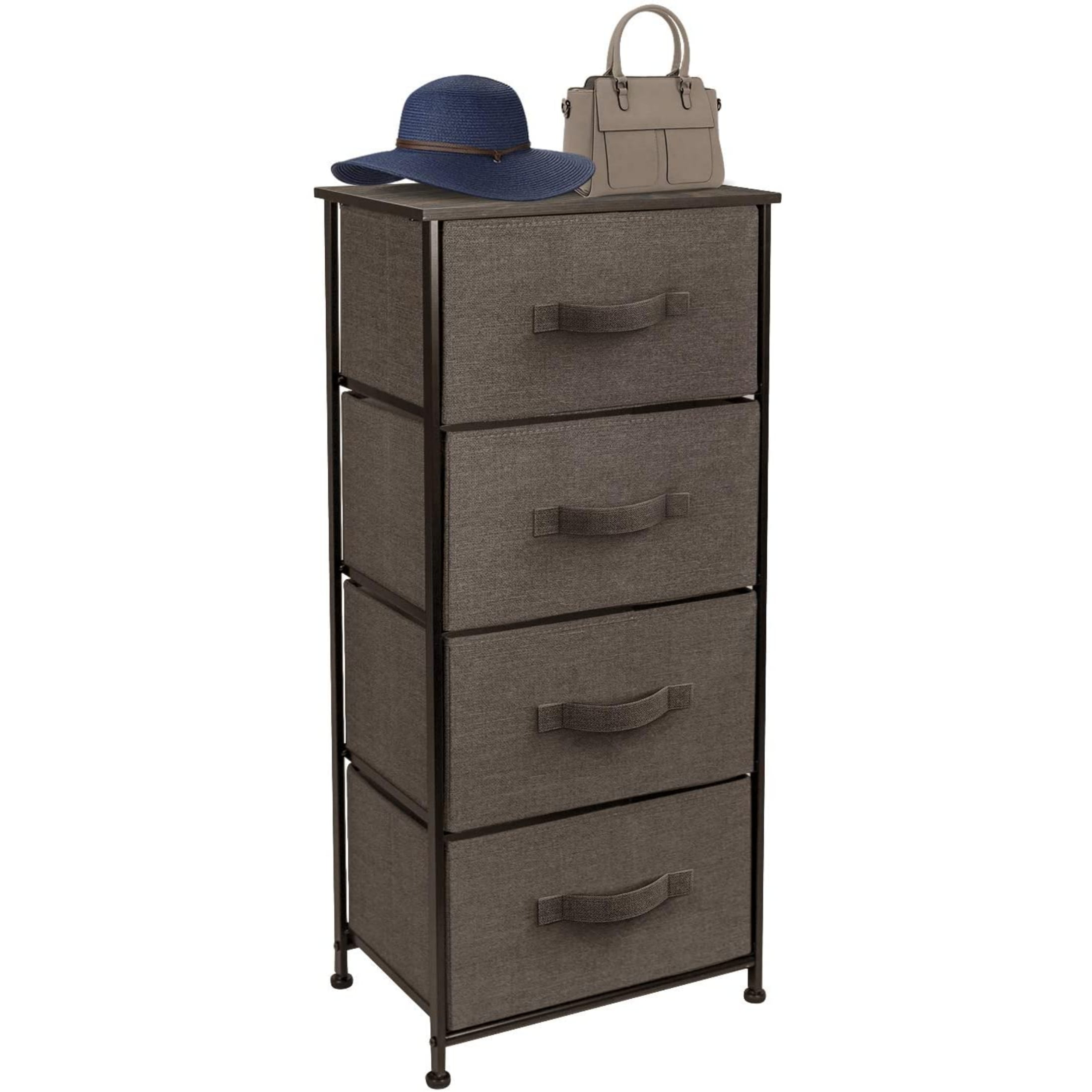 $47.29Give your household essentials a cozy landing spot with the Sorbus 4-Drawer Nightstand. This beautiful chest features a tabletop surface and pull-out drawers to tuck away household clutter. The thoughtful design is vertical for small living spaces and works equally well by the bed or sofa. Store anything from books, reading glasses, alarm clocks, clothing and other bedside necessities. The lightweight frame makes this unit easy to transport around the home and when not in use, simply fold the fabric drawers flat for storage. Use alone as a single unit or pair with any drawer configuration from the Sorbus Furniture Collection. Great for any room. Add this charming nightstand to your master suite or guest room for blankets and towels with home décor and photo frames on the tabletop. Place in any walk-in closet to organize your wardrobe and accessories or decorate a college dorm with contemporary style. Fashion-lovers might also like this sleek design, especially when paired with lush plants and gold accents in a monochrome room. The possibilities are endless! About the design. 4-drawer nightstand with built-in carry handle. Lightweight and easy to assemble. Hardware and instructions INCLUDED. Drawers made of non-woven fabric. Made of steel and MDF wood with black finish. Accessories shown in image NOT INCLUDED. Measures approximately 17.75” L x 11.87” W x 37.50”.