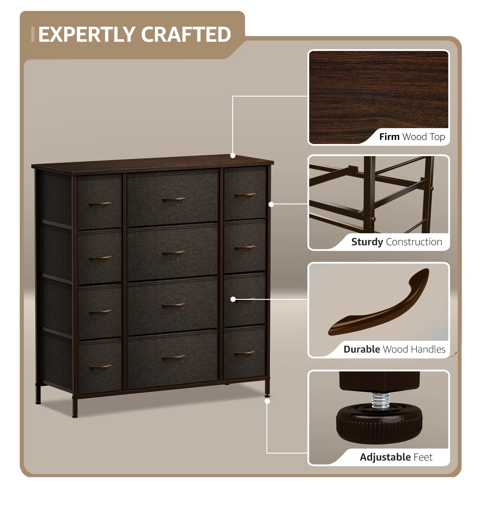 Sorbus 12 Drawer Dresser Organizer Large Bedroom Organization, Clothes Storage Drawers, Closet Organizer, Tall Dresser for Living Room, Office, Easy Pull Fabric Bins – Wooden Handle (Brown)