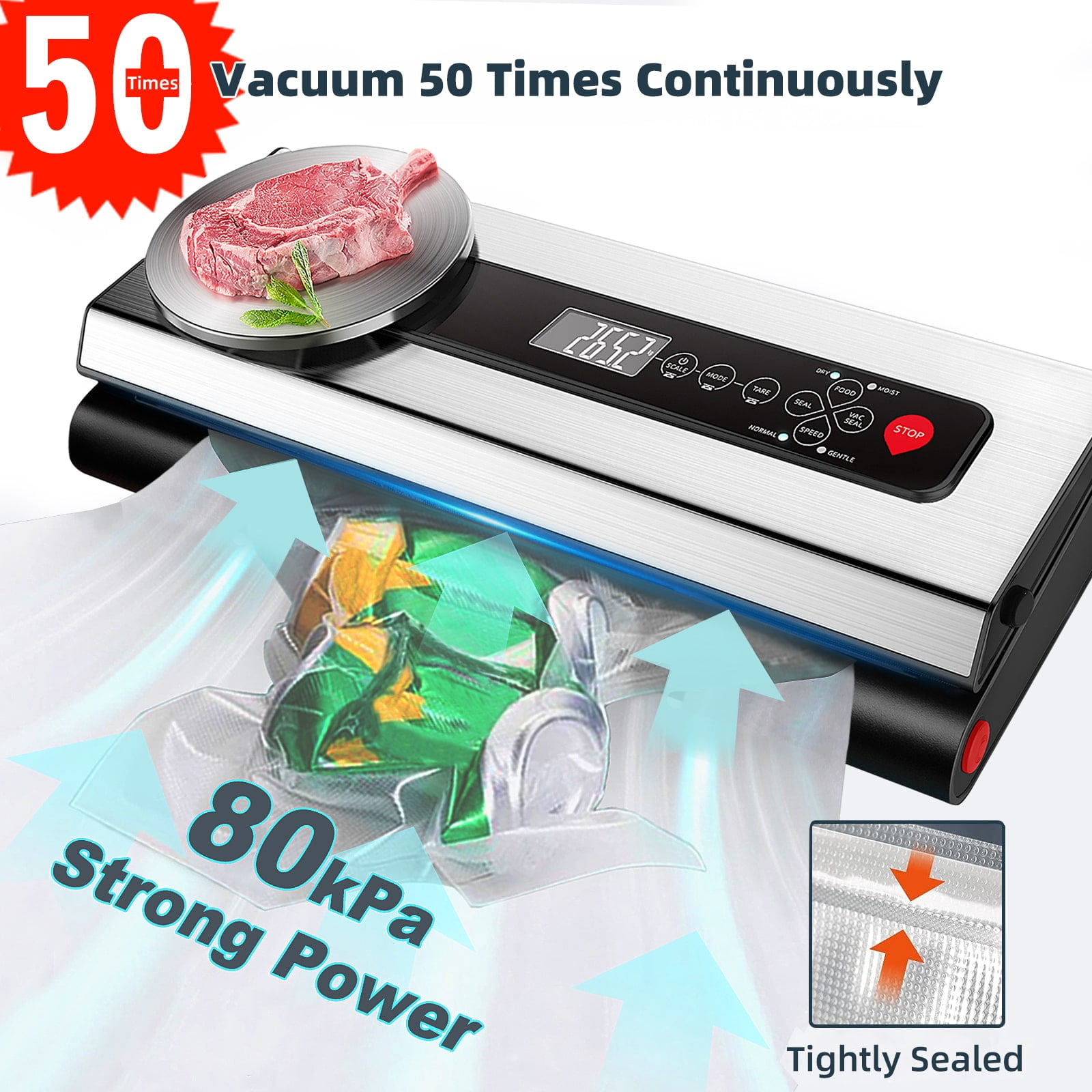 $42.99Axidou Vacuum Sealer Machine Your ultimate food freshness solution. With a strong 80kPa suction power, this compact 7-in-1 sealer keeps food fresh up to 10 times longer than traditional methods. Discover its versatility with 7 functions. Choose “Dry&Moist” or “Normal&Soft” modes based on your food type. Use “SEAL” for sealing only or “VAC&SEAL” for vacuuming and sealing at once. It even has a vacuum tube for canisters, jars, and wine bottles. The Axidou sealer boasts a robust 120W motor for 20 continuous seals, vacuuming in 3-10 seconds and sealing in 9-12 seconds. Its sleek stainless steel surface and easy-to-clean design make food preservation hassle-free. Compact size for easy storage. Specifications: Voltage: AC100-240V Power: 120W Suction Strength: 90kPa Vacuum Time: 3-10s Sealing Time: 9-12s Package Includes: 1x Axidou Vacuum Sealing Machine 1x Vacuum Rolls (8″x80′) 5x Pre-cut Bags (BPA free, 11″x16″) 5x Pre-cut Bags (BPA free, 8″x12″) 10x Pre-cut Bags (BPA free, 6″x8″) 1x User Manual 1x Air Suction Hose 1x Power Cable Backed by a 2-year warranty and dedicated customer service, trust Axidou for precision food preservation. Enhanced 12mm heating strip for strong, durable seals. Its 5-layer design ensures secure, even sealing every time. Join thousands of satisfied customers and enjoy the convenience of Axidou Vacuum Sealer Machine for years to come. Preserve food with confidence.