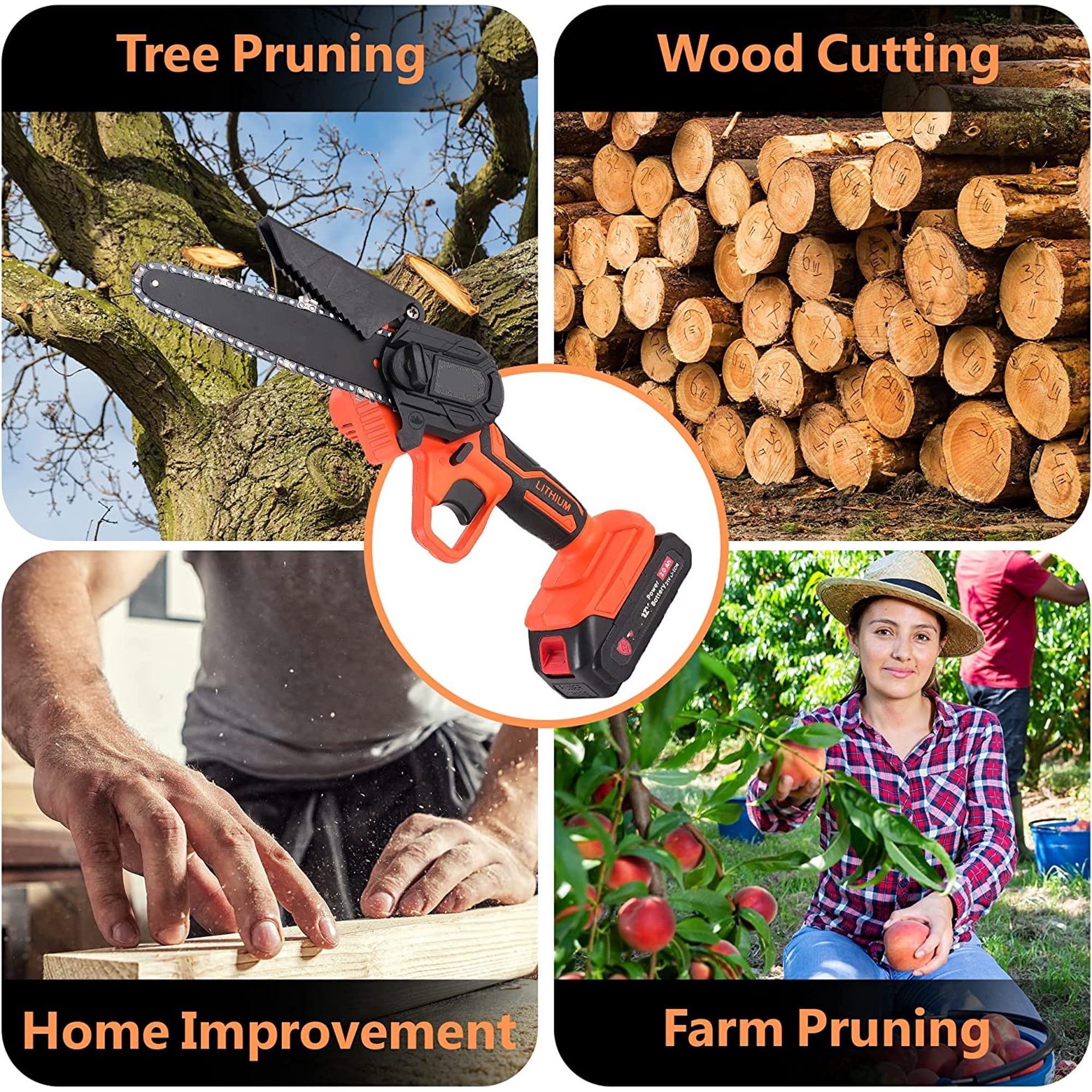 $25.796″ Mini cordless chainsaws are a great replacement for a variety of home, garden, patio or farm projects. it is suitable for logging, cutting branches, pruning branches, gardening, municipal greening projects, etc. great tool for your temporary job! Mini Chainsaw 6 Inch 2023 Upgraded Cordless Electric Saw 21V 1200W Handheld Mini Chain Saw for Wood Cutting Tree Trimming What’s in the box 1 x Premium Chainsaw 1 x 6 inch Chain Plate (Guide Plate) 2 x Chains 2 x 21V Lithium ion Batteries 1 x Charger 1 x Goggles 1 x Manual Instruction 1 x Screwdriver 1 x pair of Cut-Proof Gloves 1 x High quality storage and carrying box 1 x oil bottle (empty) Installation Steps: Step 1: Unscrew the screw to open the case; Step 2: Turn screwdriver anti-clockwise until the pin is moved to the innermost; Step 3: Align chain and chainplate in the right chain teeth direction; Step 4: Pull baffle open, and put chainplate and chain on. Notice the aligned pin and hole; Step 5: Press the plate in stably, and screw clockwise to tighten the chain; Step 6: Put the case on neatly and tighten it with a screwdriver; Step 7: Adjust the chain tightness again if needed. Turn the adjusting screw clockwise to tension the chain, counterclockwise for loosening it. ***Do not make it too tight*** Notice: 1. Please read the user manual before use. Regularly oil up the chain. Bar oil is highly recommended! 2. Only insert the rechargeable battery once the device is completely assembled, to avoid the device being switched on accidentally. 3. Before using for the first time, the battery needs to be fully charged.Check that the surface of the battery is clean and dry prior to charging. 4. After the battery is fully charged remove the charger plug from the outlet and remove the battery from the charger. 5. When the machine is not being used over a longer period of time it is best to keep the battery fully charged, It should be used and recharged at least once every 3 months.
