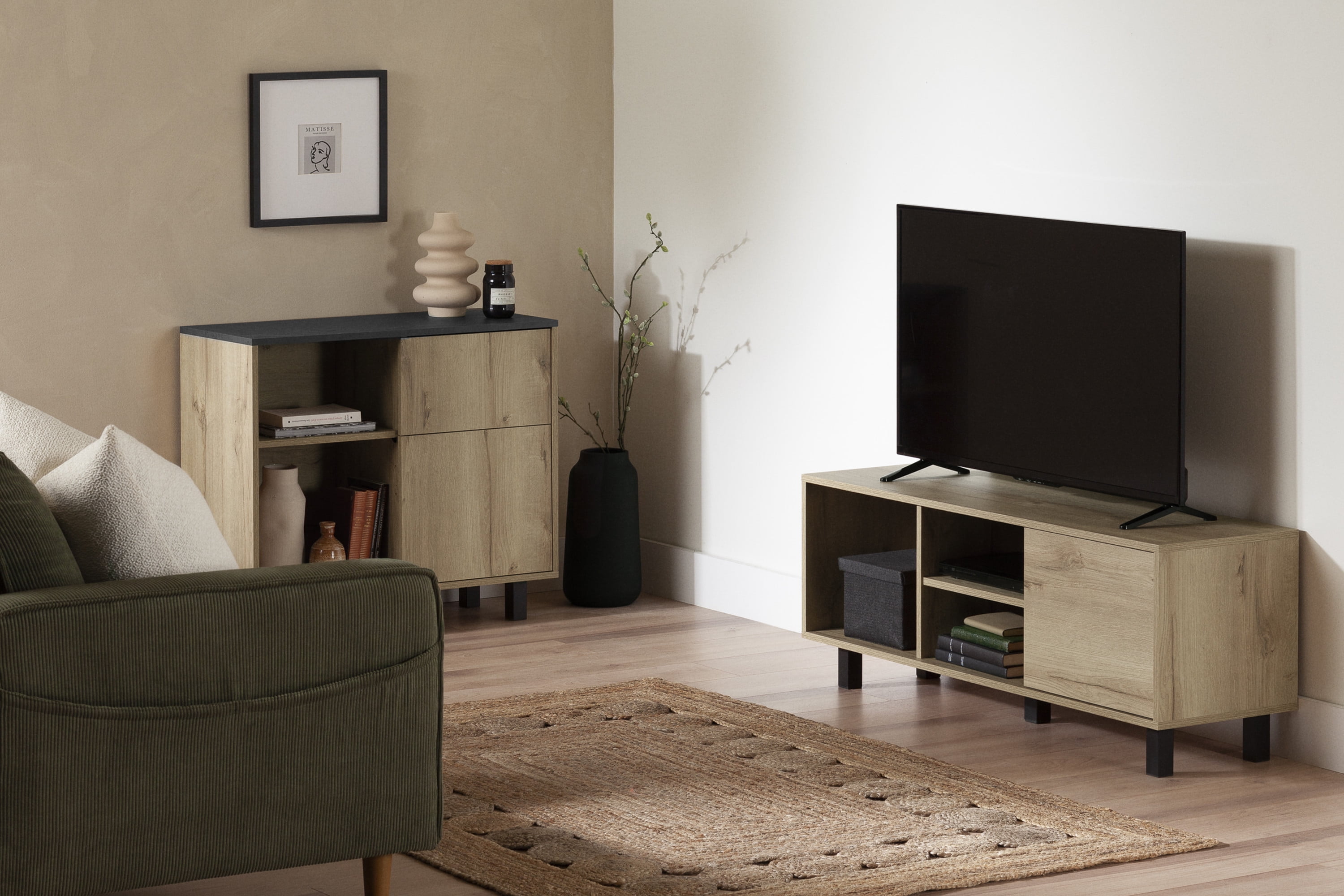 $74.61An accent cabinet Improve your living room with this charming small contemporary cabinet mounted on black metal legs. Its clever configuration combines two open storage compartments, a drawer on metal runners, and a closed space so you can mix and match the trendy items of your choice. You could place a vase or a plant on the solid surface that can support 50 lb or put your favorite novels on the shelves that can each support 25 lb. One of the shelves is even adjustable for even more flexibility. Furnish your small living room Place this cabinet along a wall in your living room or behind your sofa and it will blend in beautifully with the room’s ambiance. With its straight lines, clean finish, and subtle accents, this small, contemporary-looking cabinet is timeless. And that’s not to mention its durability! This storage unit is made of melamine, a scratch-resistant material that is easy to clean. It will last through the years and the moves!