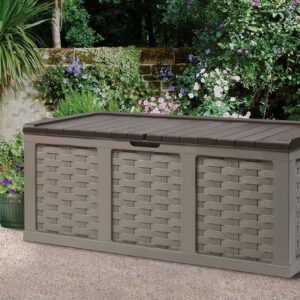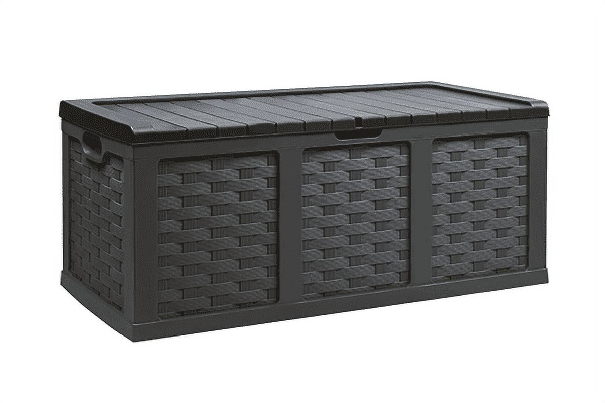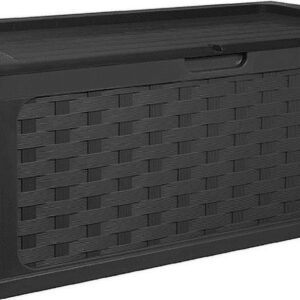 $165.97Keep pool toys, towels, tools, gardening equipment, and more inside the Starplast Deck Box. Made of sturdy plastic, it’s waterproof and stands up to the elements, while ventilation allows for airflow and moisture evaporation. A pair of wheels make relocation simple and convenient. With a pneumatic piston, the lid opens and closes smoothly. Add a padlock (available separately) for increased security. This 153-gallon deck box offers generous storage space and is sturdy enough to serve as bench seating. It’s also quick and easy to assemble and has a woven wicker design that coordinates with other outdoor furnishings.