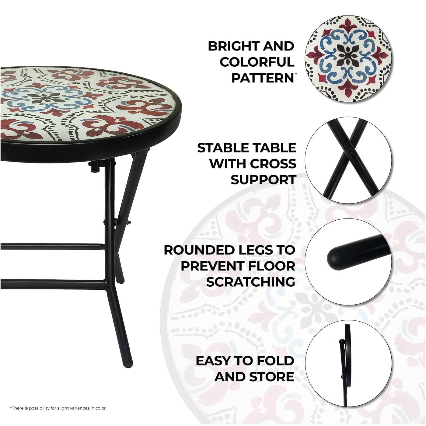 $68.75Add some color to any are of your yard with this Backyard Expressions foldable table. Folds easy for storage, with no assembly needed. This table features a beautiful glass top and powder coated steel frame.