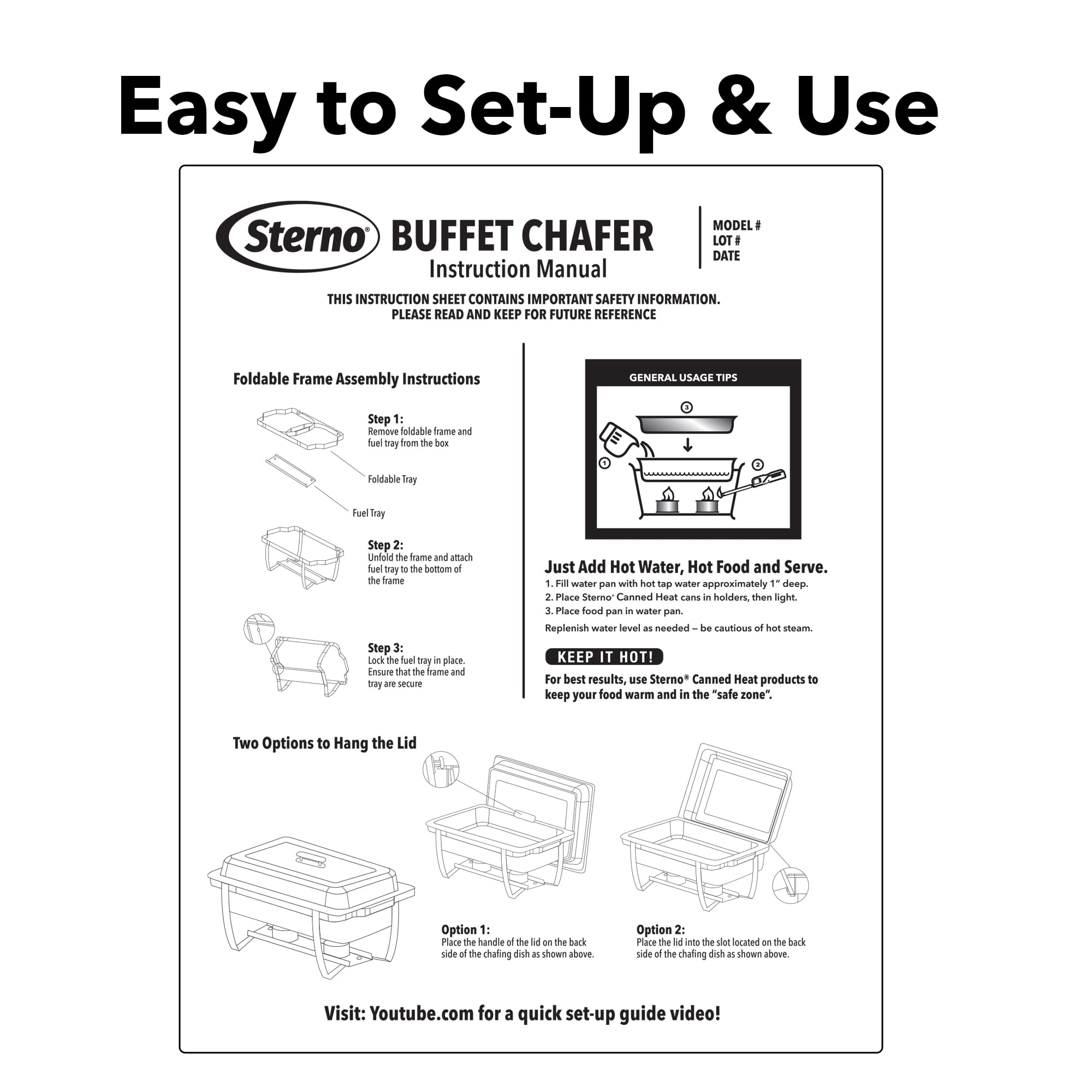 $45.57Redefine Fine Dining & Home Entertaining with Sterno Turn intimate gatherings and grand celebrations into successful events that will leave a lasting impression on guests with the Foldable Chafing Dish Buffet Set from Sterno! For over 4 generations, Sterno has led the way in developing and producing portable food-warming products that have become integral to nearly every aspect of the American experience. Set a new trend in the realm of foodservice and home entertaining with straightforward, no-nonsense solutions from Sterno. Delivering Life-Enhancing Solutions to Our Valued Partners At Sterno, delivering true value through the quality of our products and the additional benefits of every enhancement we introduce is the cornerstone of our business. We actively engage with our philanthropic partners offering hands-on assistance, financial aid, and product support. Our reputation is built on being truthful, reliable, consistent, and responsive. This commitment to trust is matched by our dedication to innovation, as we strive to create problem-solving, experience-enhancing products for both foodservice professionals and consumers. Experience Century-Long Excellence in Entertaining Since 1914, when the maker of fine chafing dishes introduced Sterno Canned Heat, we’ve been improving the quality of entertaining. For over 100 years, can after can, Sterno has ensured that food is hot, safe, and delicious when it comes out of the kitchen. Experience the tradition and innovation of Sterno in every product we offer, and trust us to turn every event into a success with our reliable and innovative solutions.