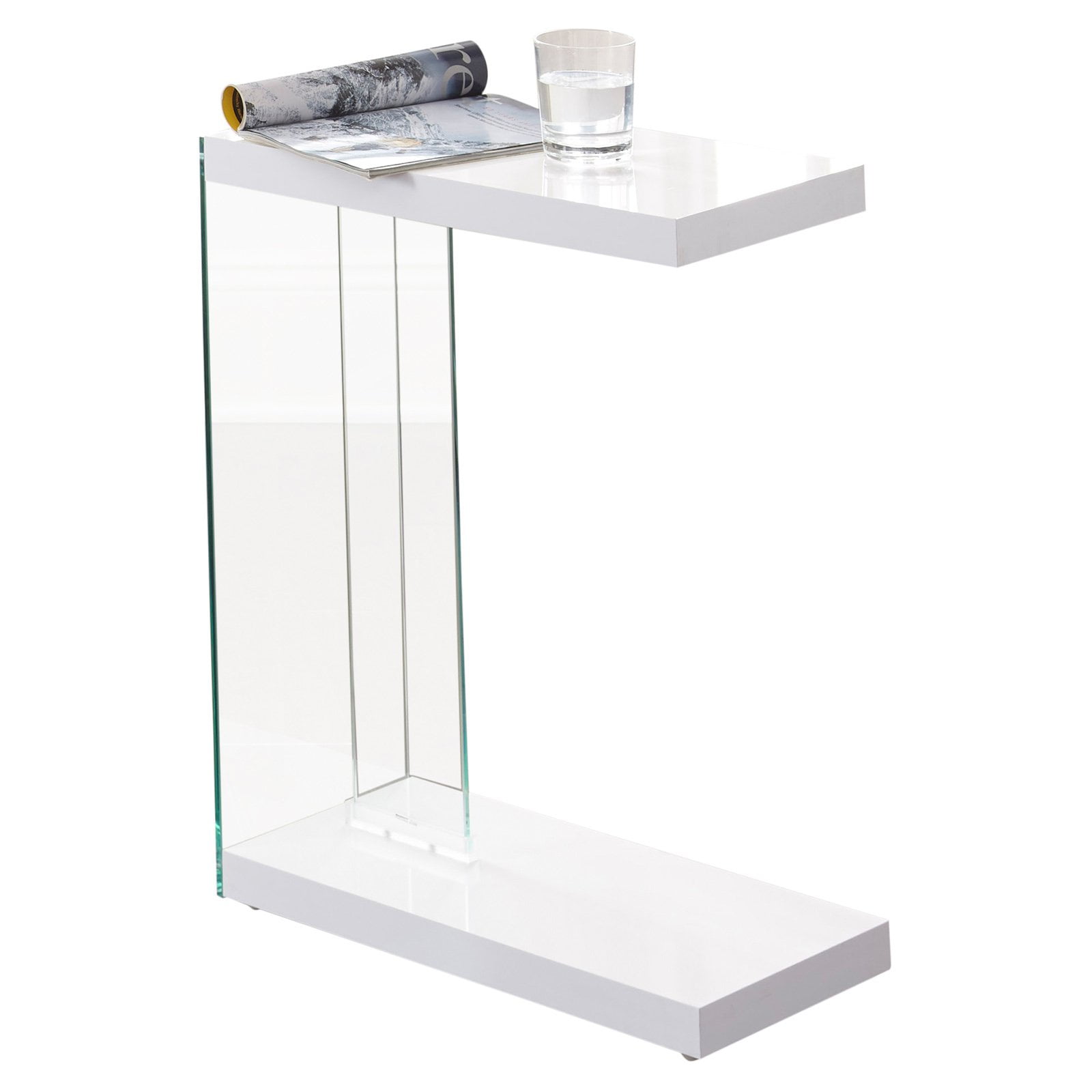 $44.71Elevate your indoor living space with the Elaina Chairside End Table, with a sleek, airy design and a functional “C” table configuration. Its glossy white finish blends with various contemporary decors, providing a sophisticated touch that doesn’t overpower your room’s aesthetic. The table is supported by tempered glass and acrylic elements, creating a light, unobtrusive footprint that’s versatile and easy to incorporate into your existing design scheme. Whether placed beside an upholstered furniture piece or tucked under a sofa or loveseat, the Elaina End Table serves as a convenient work area or a stylish surface.