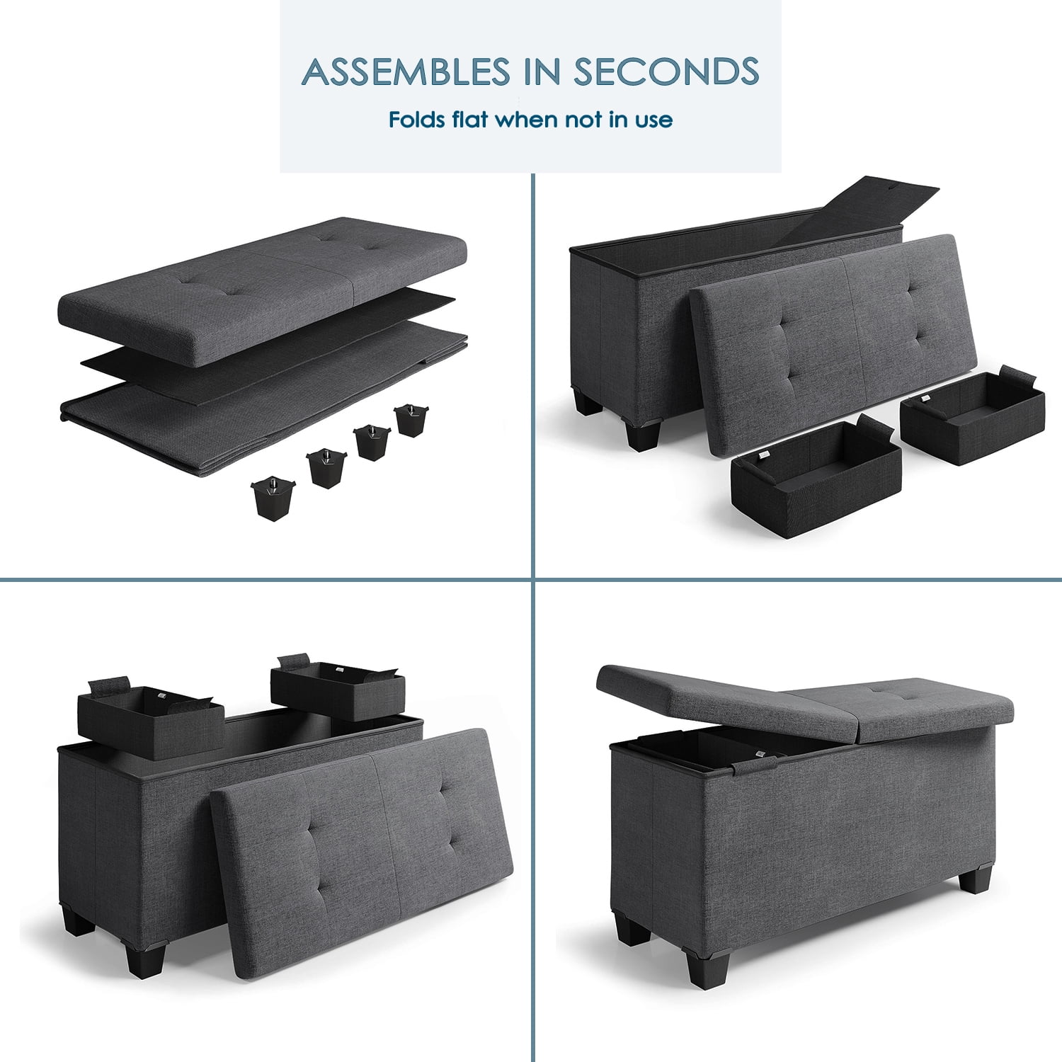 $55.62Original price was: $55.62.$43.20Current price is: $43.20.StorageBud Linen Ottoman Storage Bench, 43″ Bench, Black The StorageBud tufted storage ottoman bench serves as a coffee table ottoman for living room or fall decor. This ottoman with storage is a perfect choice to help you make the most of your living space by acting as both a storage container and a comfortable ottoman or even a footrest. Our storage ottoman can fold flat when not in use, adapting the ottoman to suit your storage needs and when in need of additional seating. The durable Linen, black ottoman helps organize essentials and accessories with this multipurpose storage bench. Our ottoman’s sturdy, cushioned lid for bedroom storage is comfortable and supportive. It has an invisible hinge design that allows it to be bent and lifted up from either side without removing the entire lid. The sizeable ottoman space stores bulkier items like throw blankets and pillows. Our 43-inch Hinged Storage Ottoman Bench Features: The bench has a classic appearance that could match most styles of house Hearth and Harbor Storage Ottoman helps to alleviate storage shortages in your home permanently Use to store blankets, pillows, books, toys, accessories, games and more Adjust the height by adding or removing sturdy legs Folding Foot Rest Ottoman with Storage for Living Room It includes 2 removable bins to keep small, loose items out of sight, neatly organized and easily accessible Our Bench is a great decor and organizer with ample storage space for your belongings and clutter Transforms your space and reduces clutter Easy Assembly Required