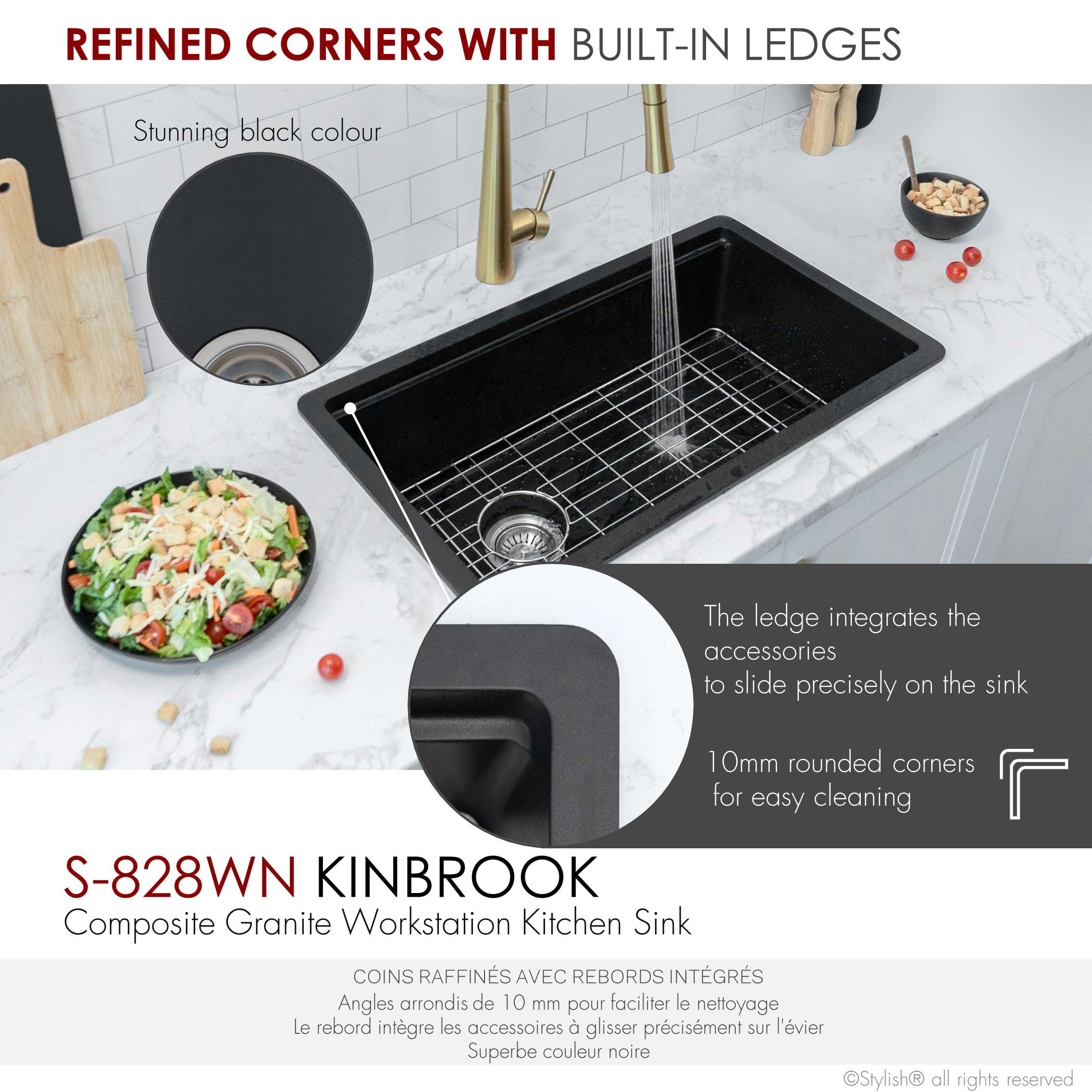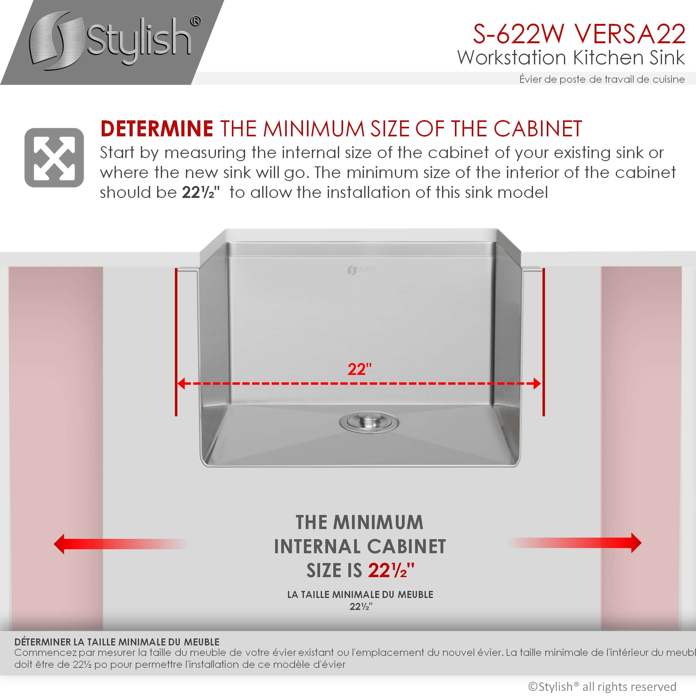 $384.42Original price was: $384.42.$361.20Current price is: $361.20.22 inch Workstation Single Bowl Undermount 16 Gauge Stainless Steel Kitchen Sink with Built in Accessories, by Stylish® S-622W Versa22 Adding style and functionality to your kitchen has never been easier with the amazing Versa22 kitchen sink workstation which includes one 22”x19” single bowl undermount stainless steel kitchen sink, one protective stainless steel bottom grid, one perfect fit bamboo cutting board. This workstation sink comes with the ledge on the longer sides of the sink. This ledge allows the kitchen sink accessories to perfectly fit making it a unique and functional experience.This product is proudly designed and specified in Canada, also meets local plumbing codes, it is supported by one of the best warranties in the market with a professional customer care team that goes beyond to ensure full customer satisfaction.