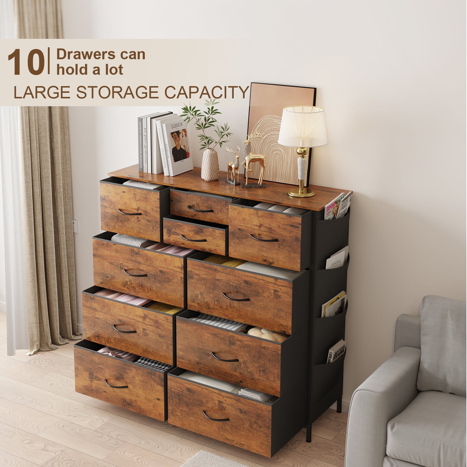 $93.74About this item. Plenty of Storage Space: The fabric dresser for bedroom is designed with 10 individual collapsible drawers, including 3 different sized drawers for your categorized storage needs, providing you with endless organizational possibilities. Additionally, the wood top provides a hard surface for frequently used items to keep them within reach. Upgraded Design and Side Pockets: Compared to other closet dressers, our dresser combines a 4 side pockets and 2 side hooks design. The side pockets add extra space for thin items. Eliminate Clutter: The SUGIFT drawer dresser is a great way to keep you neat and organized. It is the perfect addition to any modern décor for bedroom storage, entryways, hallways, closet organization, living room or nursery storage, college dorms, small apartments, or playrooms, and pairs perfectly with your other storage furniture. High Quality and Stable Structure: This tower chest of drawers is made of sturdy steel frame, MDF wood waterproof countertop and high-grade non-woven breathable fabric for reliable strength and stability, while the back bar again enhances the stability of the structure! Easy Assembly and Friendly Customer Service: With easy-to-understand assembly instructions and numbered parts included in the package, you’ll have a brand new dresser in no time at all. If you have any questions about our 10-drawer dresser, please feel free to contact us.