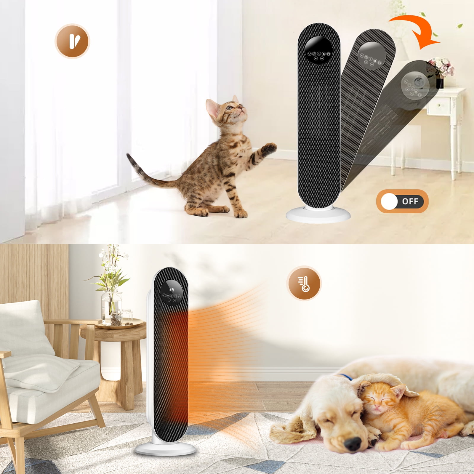 $49.011500W Slim Portable Vertical Room Quick Heating Tip Over Protection Oscillating Infrared Ceramic PTC Tower Fan Heater Fast Heating & Constant Temperature: Ceramic heaters are, typically, the most effective type of electric-resistance radiant heaters. Rather than run up a gas bill heating your entire house, simply warm the room you’re actually in. Includes a multi-function remote for convenience and built-in safety features. Specification Color: White Comes fully assembled Application:Hotel, Household, room home bathroom Power Source:Electric Heating Element:PTC Installation:Freestanding, PORTABLE 2 heat settings: 1000W / 1500W 12-hour auto-off timer 60% Wider Heating Range: Our 26 inch tower heater has a larger heating element, with 70° swing function helps heat cover every corner of your room. Perfect choice to quickly heat small to large rooms including office , bedroom, and living room on cold days. Multiple Security Guarantees: Our ETL-certified electric heater is made of V0 flame retardant materials. In addition, it also has overheat and tip-over protection. The special plug can prevent short circuits during use, allowing your pets and children can close to it safely. Smart Thermostat Function: Simple control, you only need to set the required ambient temperature (60-99℉ switch at will), Ceramic Space Heater uses the built-in precise temperature sensor to always keep your room at a constant temperature while saving more on energy bills. Quiet Soft Wind: Throw away those noisy heaters that make you unable to sleep well! Our portable electric heater uses a unique a new shaded-pole motor, which greatly reduces fan noise and delivers quiet, warm breezes, bringing long-lasting comfort for your sleep and work in winter. 1-24H Timer: You don’t need to wake up in the middle of the night. Our electric space heater has a 24-hour timer function, allowing you to sleep quietly and comfortably while saving electricity. Portable & Space Saving: The whole is compact, it can be easily placed in the corner without taking up too much space. The hidden handle can help you move around freely and bring warmth to the entire room.
