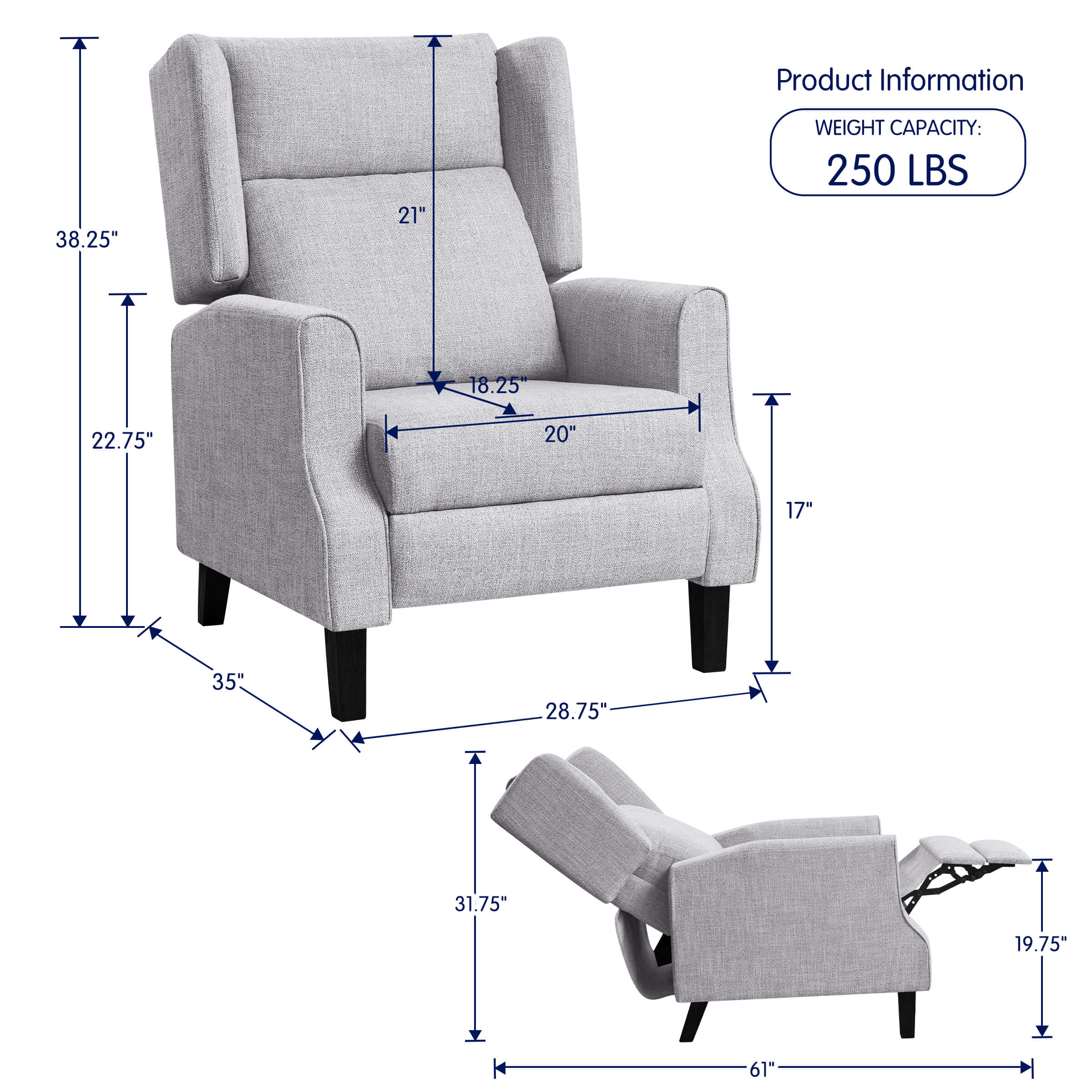 Subrtex Push Back Recliner Chair, Modern Upholstered Manual Wing Chair with Extending Footrest Linen Fabric Recliner Chair (1 PC, Gray)