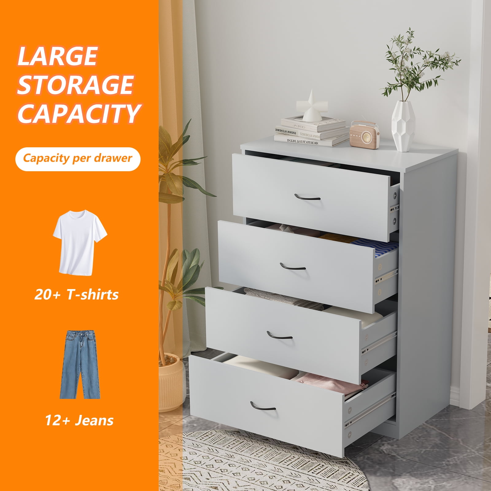 SUGIFT 4 Drawer Dresser for large space Wood Storage Cabinet for Living Room Chest of Drawers with Metal Handle