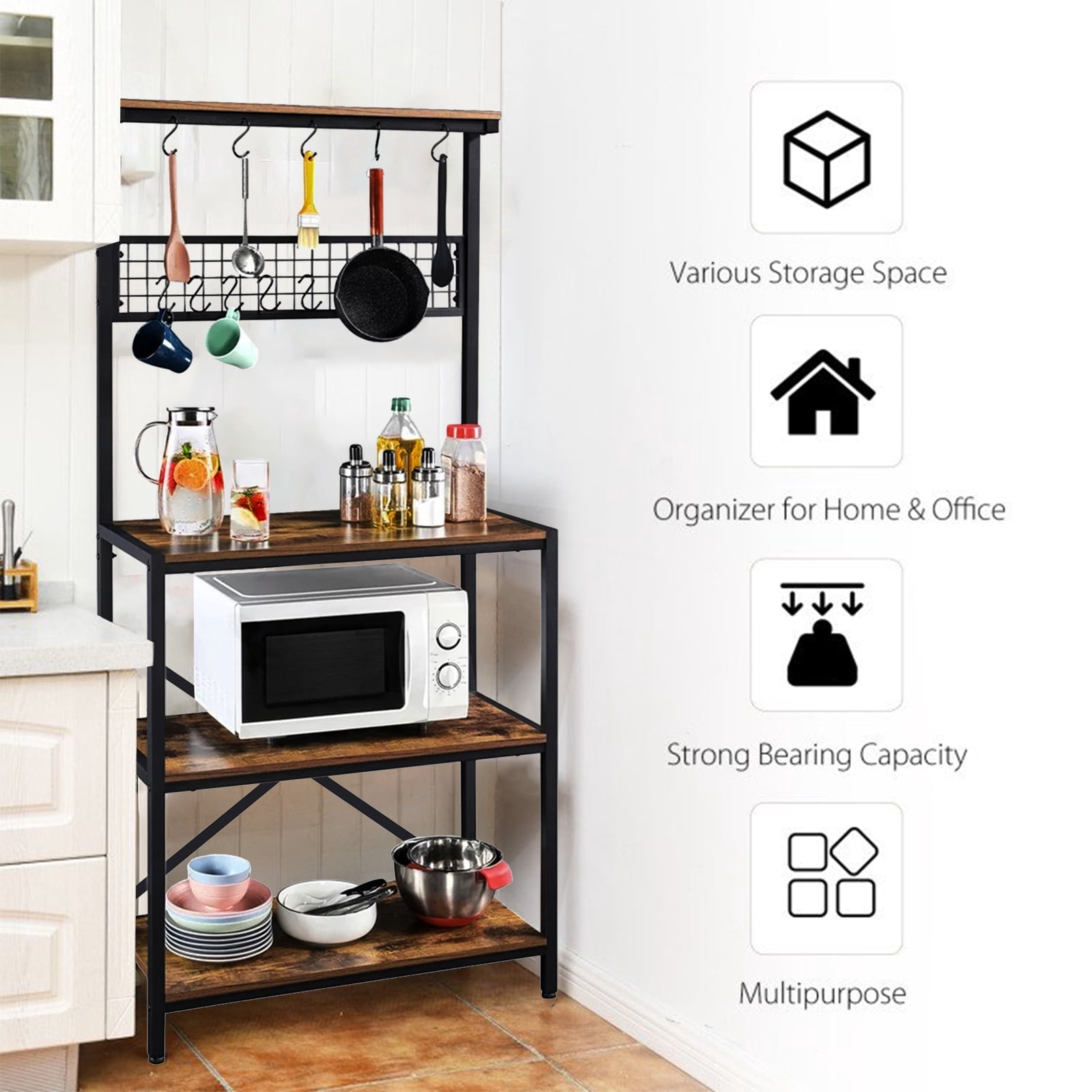 $67.94The 4 Tier Bakers Rack design of the 4-Tier kitchen rack stand, provides ample storage and classified space to make your home tidy and neat. The baker’s rack is superior in quality and classic in design! Made of certified environmentally particle board and iron tubes, the baker’s rack is sturdy and durable for a life span. It also does excellent in rust resistance with a paint-coat on it.Adjustable feet provide great stability. 4-layer design, provides ample storage and classified space, making your home tidy and neat. Moreover, 10 S-hooks help to hang up objects like pans and ladles conveniently and effortlessly!Don’t hesitate to buy it.