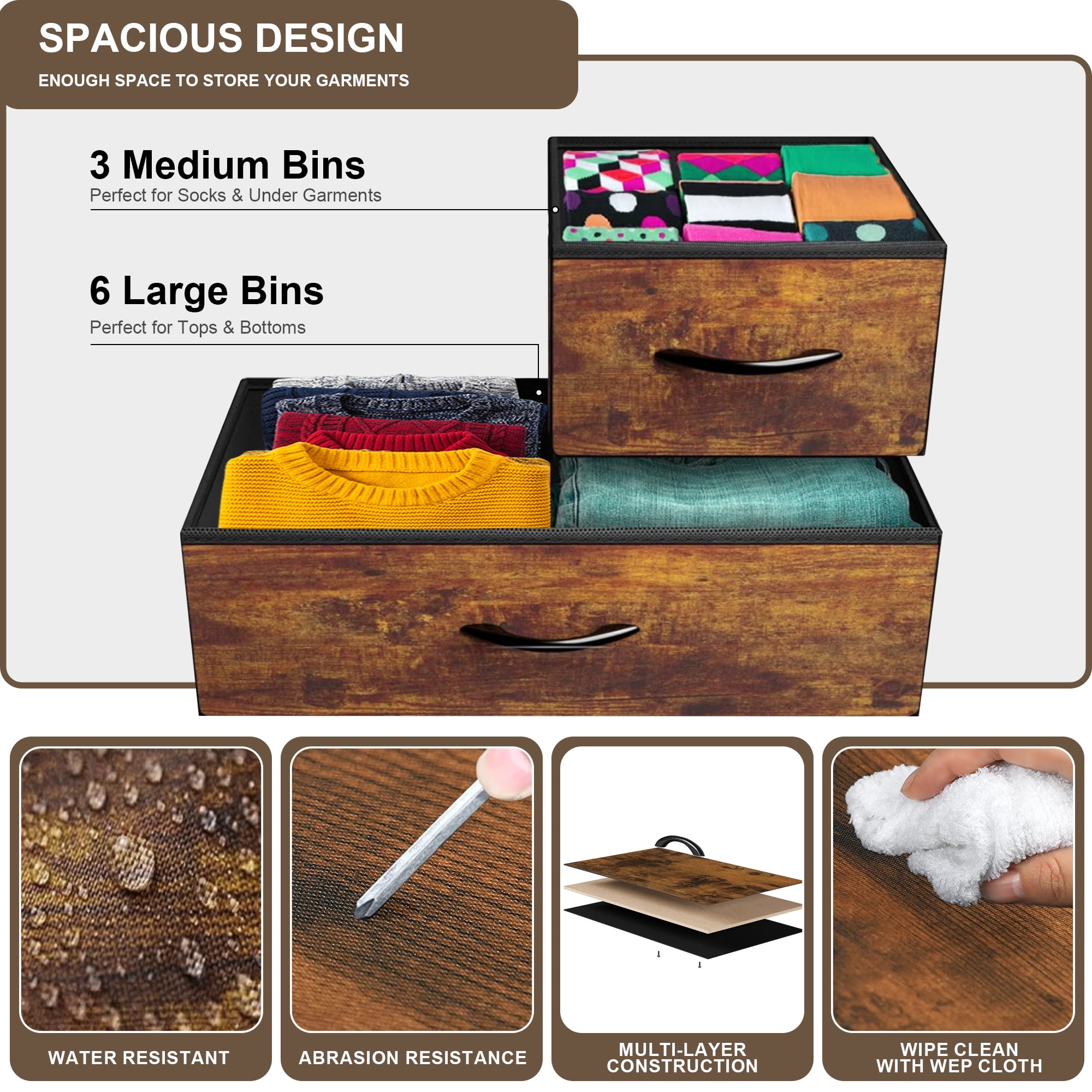 SUGIFT 9 Drawer Dresser, Chest of Drawers for Bedroom , Fabric Dresser with Side Pockets for Closet, Brown