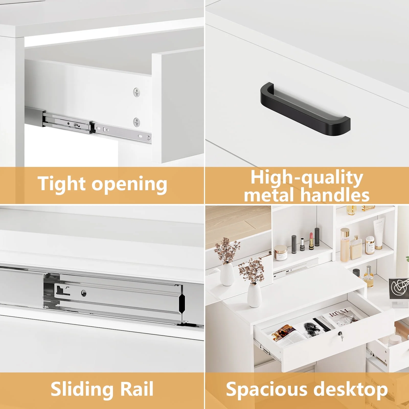 $146.16Original price was: $146.16.$124.16Current price is: $124.16.Ample Storage Space,Say goodbye to mess! Are you still bothered by the fact that you have too many cosmetics and nowhere to put them? Try this makeup table with great storage function, it will be a great choice for you! It features a broad tabletop, multiple drawers, a tabletop shelf, and side storage shelves. The unique sliding mirror glass door ensures your cosmetics and beauty essentials are organized and within reach. Let you have a neat and tidy desktop. Our (makeup desk) merges classic retro vibes with modern functionality, highlighted by the stylish glass door design on the side storage shelves. This (white vanity desk) not only serves its purpose but also adds a touch of sophistication, making it an ideal gift for special occasions.