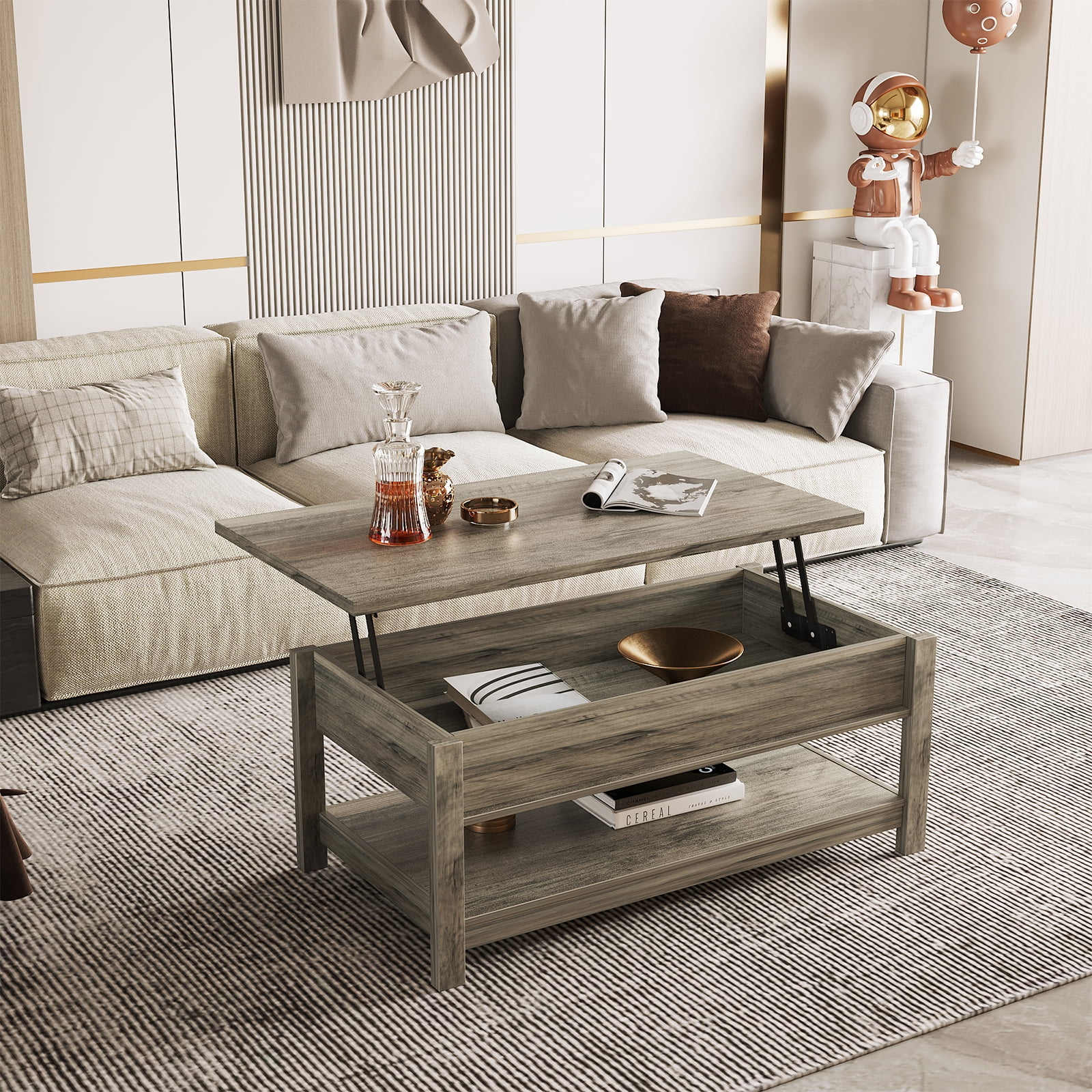 $110.93About this item 【Lift-top Design】: The high-quality lifting top mechanism enables the desktop to be raised and lowered easily and silently. When you are sitting on the sofa, it is perfect for working, dining and extra storage in the living room or office. 【Spacious Storage】: Open the modern coffee table, you can store the laptop, chess, remote control, game controller, blankets, books, toys, and other common items under the table, convenient and not dirty. 【Sturdy & Durable Structure】: This lifting top coffee table is made of EPA standard particleboard, which is strong, waterproof and easy to clean, providing you with a safe and healthy living environment. The solid wooden legs can not shake or tilt after being assembled correctly. 【Modern Style for Multiple Use】: Coming with clean lines and modern appearance, the coffee table matches well with various of decorations and adds a touch of elegance to your room. It combines both fashion and versatility for your home, which is suitable for office, living room, study or any other space. 【Easy Assembly】: Our coffee table comes with instructions for the required parts and an illustrated installation manual to ensure that you can assemble this table quickly and easily. If you have any questions about the product, please feel free to contact us, we will reply you within 24 hours. Specifications: Color: Rustic Gray Material:E1 grade particle board Product size: 43.3x 23.6 x 18.1 inches E1 grade particleboard thickness: 0.59 inches Package Contents: 1 x Coffee Table 1 x Accessory Pack 1 x English Manual