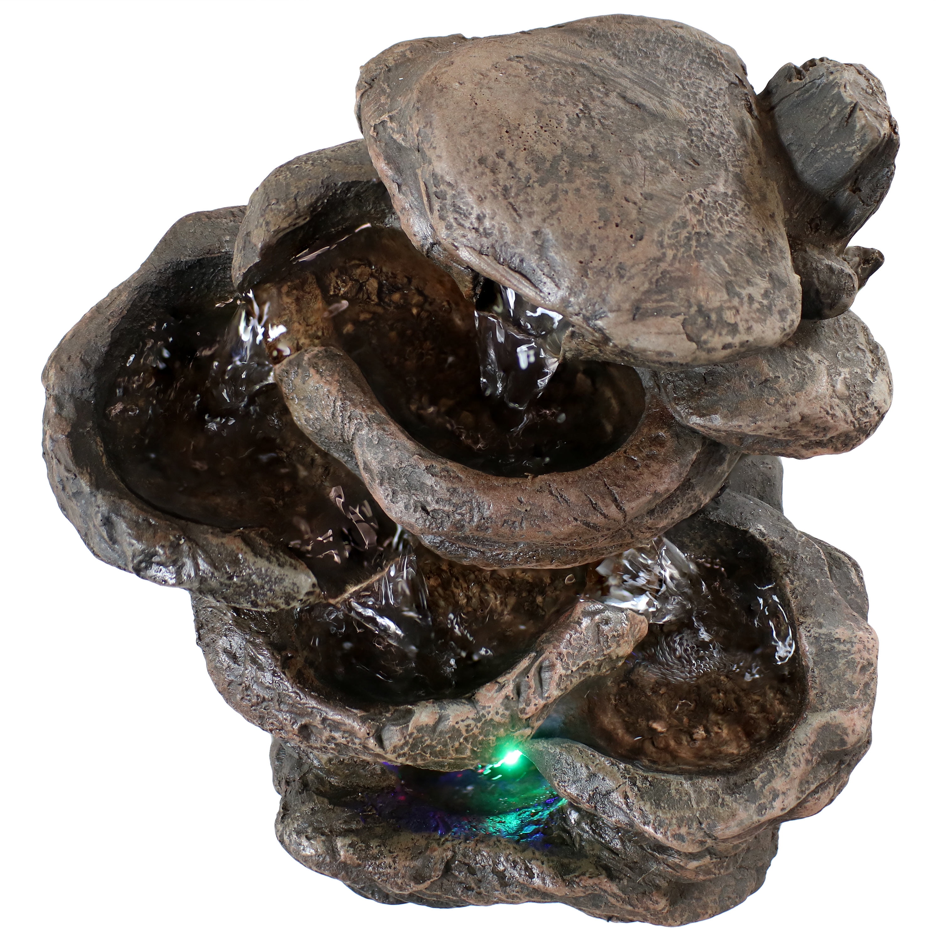 $54.14Made from durable polyresin and fiberglass to look like real stacked rocks, this fountain creates the striking views and soothing sounds of nature. This small fountain is a wonderful accent for any room in the home. Its durable material mimics the look of natural stone, but with a convenient lightweight and easy-to-maintain construction. The included electric submersible fountain pump allows the gently flowing water to trickle down from the top tier to collect in the bottom pool where it continuously circulates back through the fountain. This indoor, tabletop fountain features padded feet to protect surfaces against scratching. It also features an authentic, natural coloring and LED lights on the 1st, 2nd, and 3rd tiers so everyone can appreciate this tabletop fountain’s beauty during the evening, even as the sun goes down. This decorative fountain can be enjoyed on a desktop, entryway table, end table or anywhere within the comforts of one’s home or office.