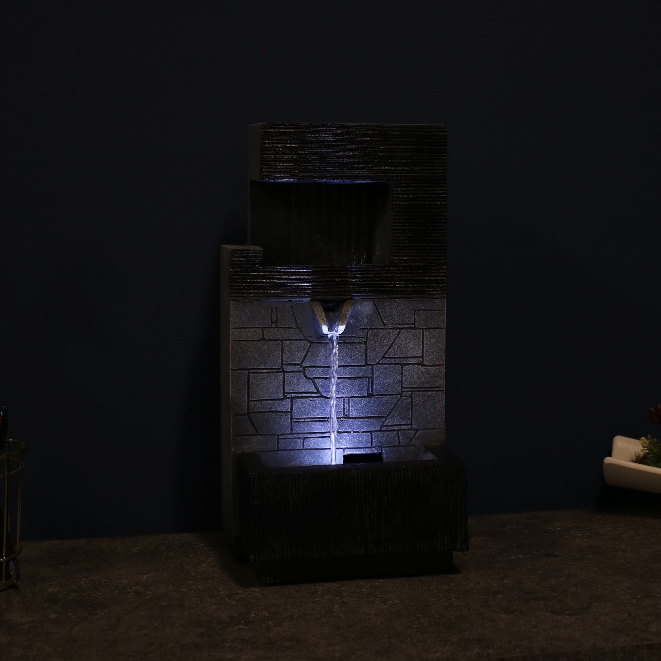 $72.81Bring the tranquility of a peaceful, rocky waterfall into a home or office with this indoor tabletop water fountain. Durably constructed of polyresin, this material beautifully replicates the color and texture of natural stone yet is easy to clean and maintain. This indoor water feature has built-in LED lights that beautifully illuminate the falling water for added appeal for nighttime relaxation. This fountain is also very simple to put together. It includes 1 tabletop fountain and 1 electric submersible pump that continuously circulates the water, eliminating the need for complicated plumbing or installation. This fountain features rock-like elements to accentuate its natural accents. The small waterfalls replicate water gently flowing down mountain slopes. Place this feature in the office, kitchen, living room, bedroom, or any other environmental to alleviate stressful energy.