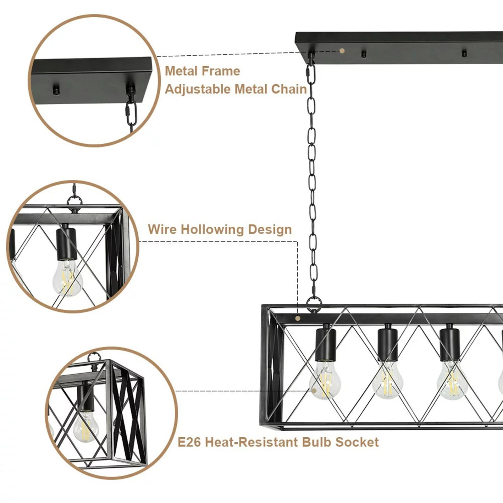 $77.19Original price was: $77.19.$60.19Current price is: $60.19.Elevate your living space with the HueGear 4-Light Industrial Pendant Light Fixture. This sleek and stylish LED pendant light features a matte black rectangular frame with a unique wire design, offering a modern industrial look that complements any decor. Equipped with an adjustable height range of 13 to 45 inches and 4 versatile lighting options, including 3-color changeable bulbs, this pendant light provides ample illumination for your kitchen, dining room, bedroom, or any other room in your home. Crafted from durable metal and backed by a satisfaction guarantee, this pendant light is easy to install and ensures a seamless purchase experience.
