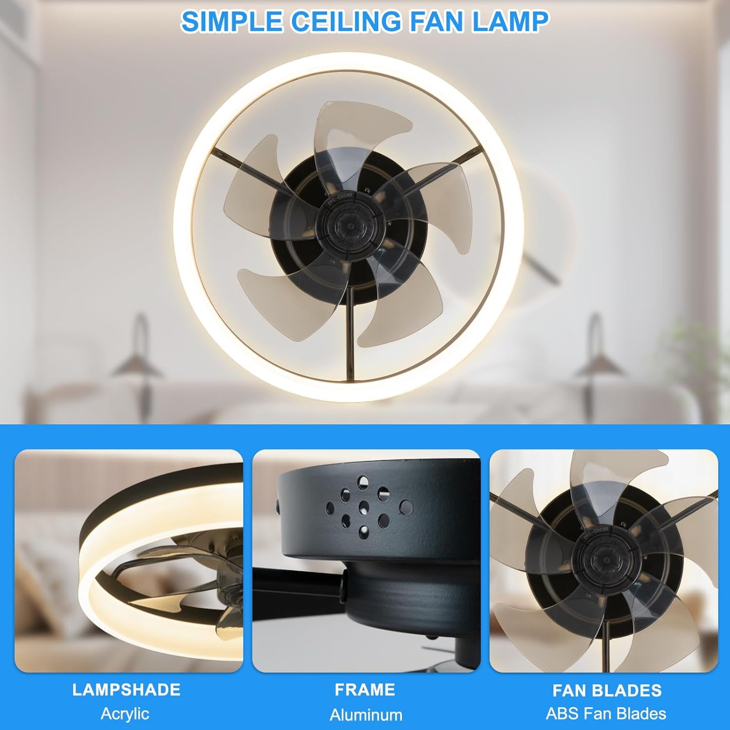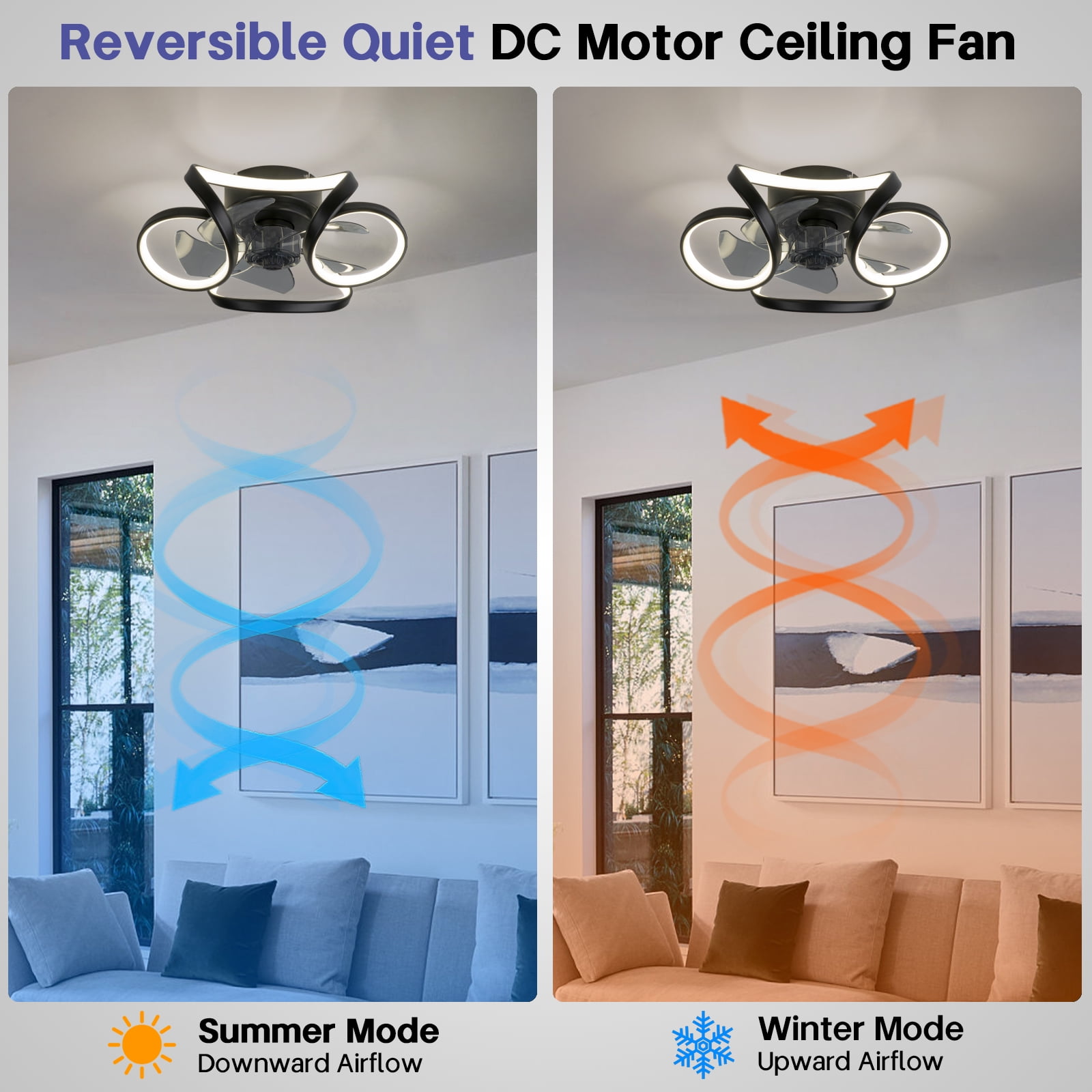 $103.19Ultra-Quiet Powerful Motor: Built-in quiet pure copper reversible motor, lower than 30 decibels when working, suitable for studying, working, sleeping and resting. The reversible function is suitable for any season. The forward rotation will bring you strong wind in hot summer; the reverse rotation will promote indoor air circulation in cool winter. Bladeless Ceiling Fan for Indoor Outdoor: 20.5in*6.5inch in size. (520mm in diameter, 165mm in height) . Covering space dimensions up to 100-170 ft�, such as bedrooms, living rooms, study rooms, children’s bedrooms, kitchens, offices, conference rooms, etc.The remote control distance is up to 10m, adjust the mode you want anytime, anywhere. The applicable battery for the remote control is 2*AAA (NOT included in the package) Flush Mount Ceiling Fan Timing Memory: Adjustable 1/2/4/8 hours timing. Set it up before going to bed, it will automatically turn off when you fall asleep to save energy. With memory function, the next opening will still retain the previous mode for convenient use. The geometric curve design increases the visual beauty and is suitable for most home decoration styles. Ceiling Fans with Lights and Remote: Provide you with 6 wind speeds, 3 adjustable color (cool, warm, neutral light). The function of fan and lighting can be controlled separately, making the ceiling fan light both beautiful and practical. After-sales service: The special design of this semi-open fan makes it easy to clean and safer to install and use. The package includes 1*ceiling fan, 1*accessory pack, 1*remote control, 1*instruction manual. Please carefully follow the installation steps in the manual when installing the fan. If you have any questions, please feel free to contact us, we will answer you comprehensively.