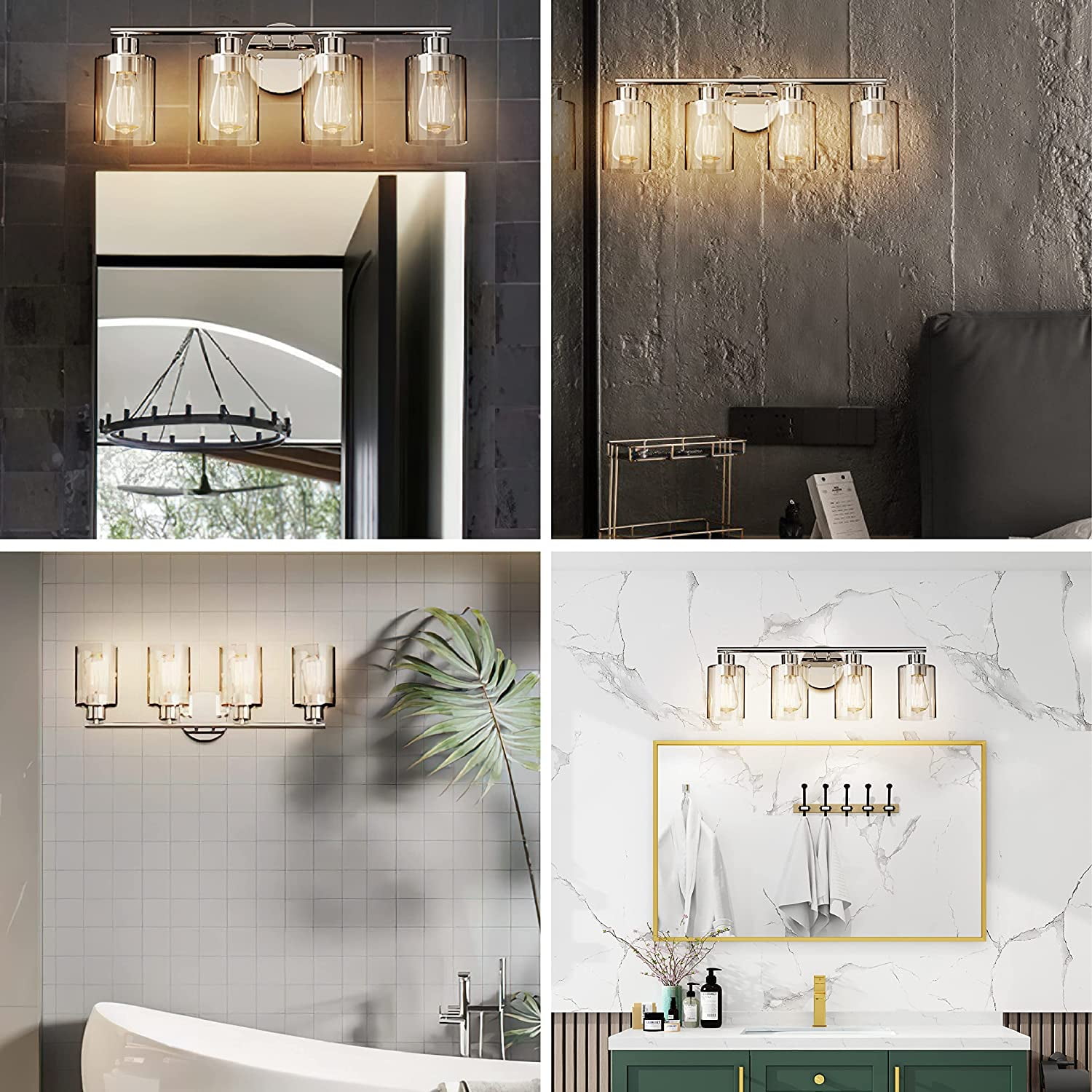 $39.55【Modern & Durable Construction】- The 4-Light Vanity Light is built in a sturdy metal lamp body with clear glass shades. Withstands well through years of usage without getting oxidation or color fading. It suits perfectly a damp place such as a bathroom, laundry room, etc. Whether your house is a modern, vintage, country farmhouse, or industrial architectural style, it can be used to match your decor. 【E26 Standard Base Required】- Our bathroom lights are compatible with all E26 standard USA sockets such as LED, Incandescent, CFL, RGB, Halogen, or Dimmable Bulbs ( Bulb are not INCLUDED, MAX 60W for each bulb). This 4-Light sconces wall decor blend is excellent with different bulb styles to bring you a different taste for your ambiance. 【Easy & DIY Installation】- All mounting hardware required for bathroom sconces installation is included in the package. Only need to connect the wire, then place the glass shades and bulbs. With a modern DIY function, it can be mounted facing upward or downward to suit your needs. You can install it easier anywhere you like by yourself. 【Wide Application】- This Light Fixtures with the perfect dimension of glass shade:3.9″ x 5.5″ (L x H) and wall sconce:24″ x 8″ (W x H) which is an excellent idea for your bathroom mirror or bedroom, living room, dressing table, vanity cabinet, mirror cabinets, doorway, hallway or entryway, corridor, foyer, bar coffee shop. Also, it can be used as a wall mount light, single vanity light, bathroom light, etc. 【After-sales service】- GOSONKT provides 30 days of free returns and a 2-year warranty free replacement. If you have any problems with our product, don’t hesitate to get in touch with us. Our customer service will reply within 24 hours!!