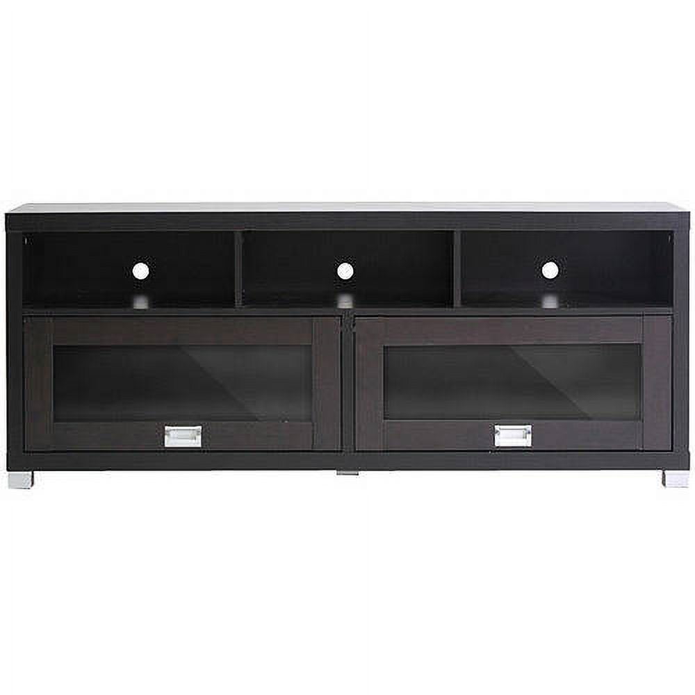 $97.45The contemporary style of this TV stand will beautifully complement your home’s decor. It includes two sliding overhead-style doors with glass panels and sliver drawer pulls and legs. The convenient holes in the back panel make managing all your media cables easy.