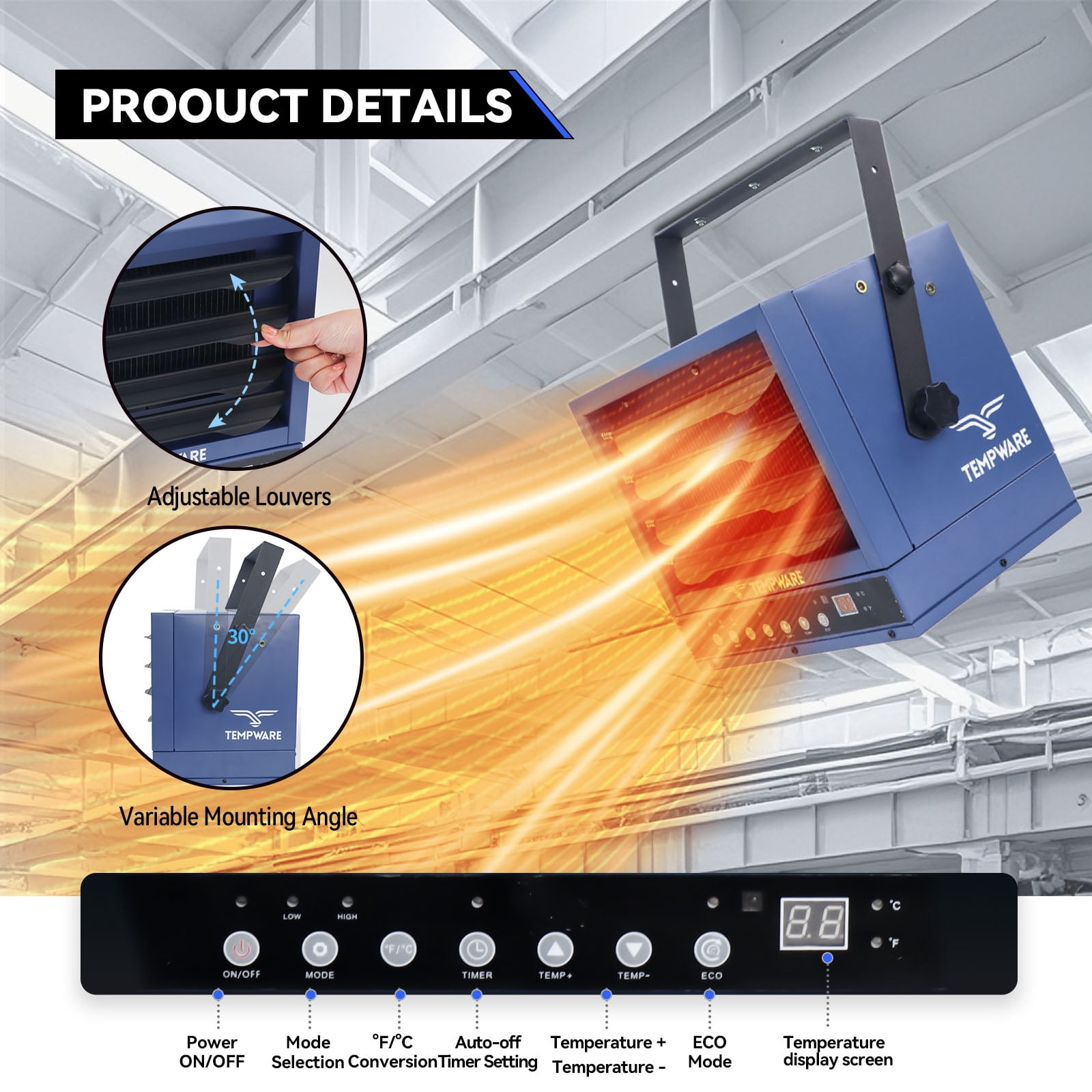 $120.39Adjustable Angle & 2 Heat Settings: This garage heater has adjustable louvers and variable mounting angle to direct the air output. Its maximum BTUs of is powerful enough to heat a large area up to square feet. Power ranges from low to high of to watts to meet your different needs,ECO Mode & Timer Function: With a built-in precise temperature sensor, the smart ECO mode automatically adjusts the working mode or turns based on the ambient temperature. You can also set an auto-off timer ( hours) to save on energy bills,Thermostat & Overheat Protection: Our garage heater is equipped with a built-in thermostat. You can adjust the power to suit your needs and preferences (from 45 F to 95 F). And a built-in sensor switches the device automatically if it overheats,Safe & Sturdy Structure: Our electric garage heater is made of heavy-duty steel material, which is very strong and durable, and has a long service life. In addition, the heater for workshop is ETL certified to ensure your safe use,Hardwired Installation: You will need an electrician to do this safely. The garage heater must be grounded and hardwired to a properly sized current protection circuit breaker in accordance with the (US) National Electric and local s,Note:This heater does not come with a power cord