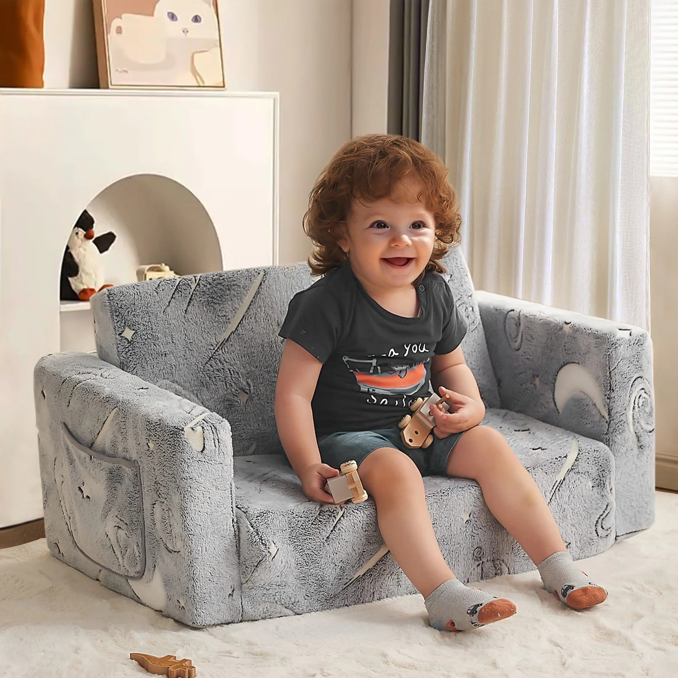 Teler Kids Sofa Toddler Couch Extra Wide Glow in the Dark Baby Convertible Sofa ,Foldable Toddler Bed for Girls Boys