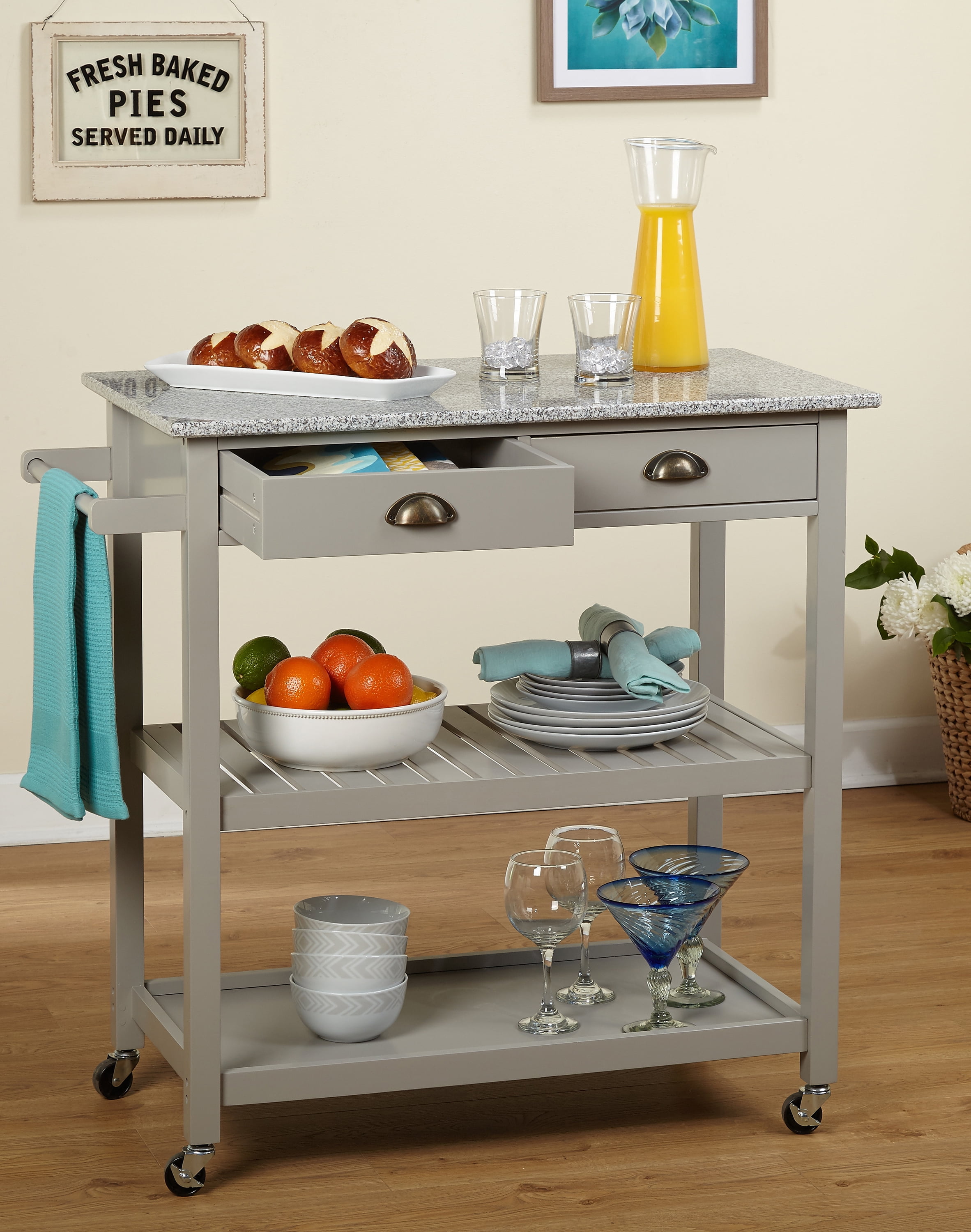 $154.01The handy Oregon 3-Tier Kitchen Cart by Simple Living offers you storage space and an extra work surface. A convenient rolling cart which can be used as a prep area, island or simply a place to store your extra kitchen essentials, the Oregon Kitchen Cart features a beautiful granite top, two drawers for tools or silverware and handy towel bar. Two large storage areas below to store cookware, dishes and more. Locking castors allow easy mobility. Constructed of MDF with a granite top. Available in White or Gray. Kitchen cart overall dimensions: 35.5 “H x 34.1 “L x 19.75 “W. Product Weight: 69 lbs.