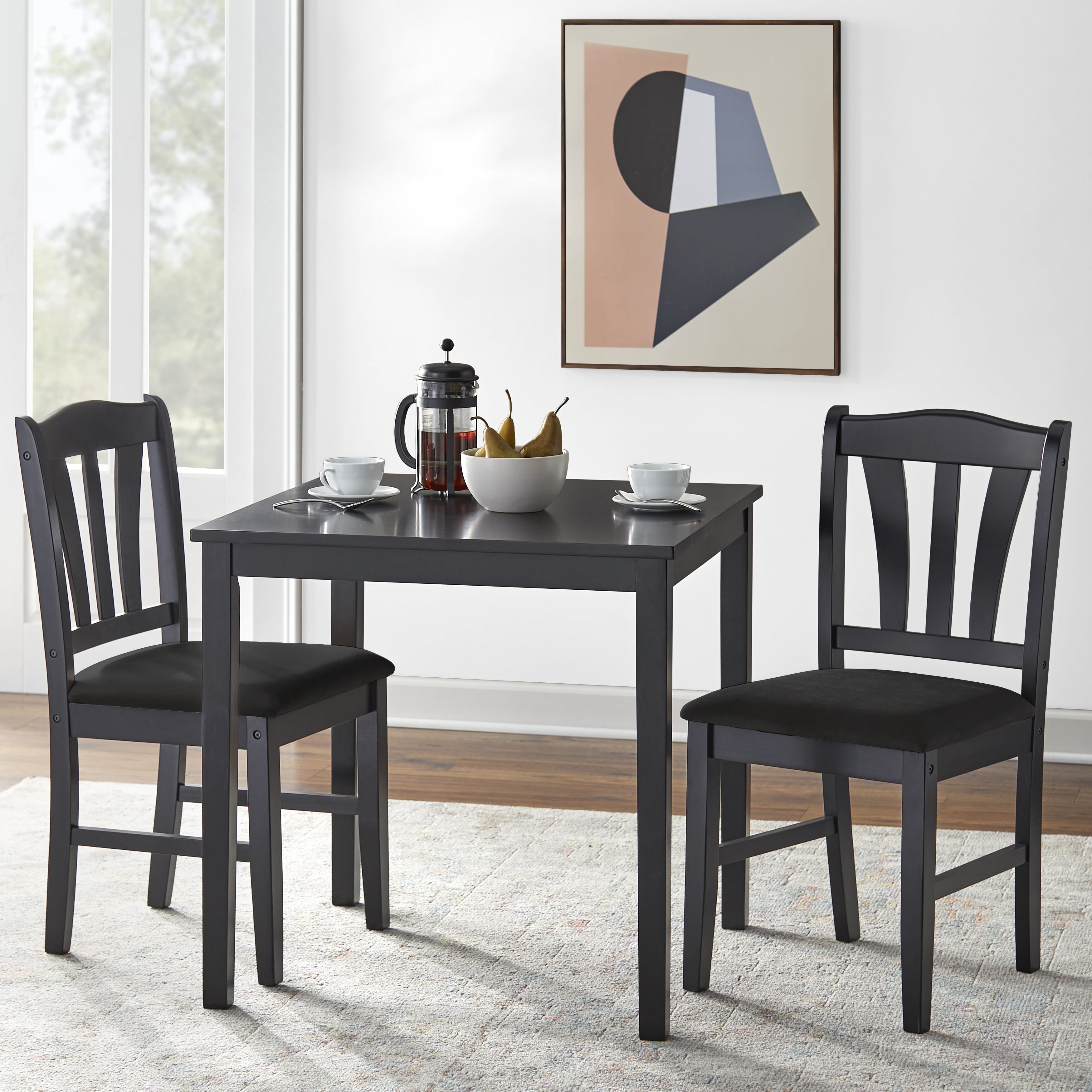 $168.56Change the look and feel of your home with the Metropolitan 3-Piece Dining Set from Target Marketing Systems. It was designed to complement a small dining area. It’s ideal for a variety of uses like a cozy dinner or to enjoy a simple cup of coffee. The small kitchen dining set also fits well in more quaint kitchens or apartments. Trendy and sleek, this set comes with two chairs. The seats have microfiber and foam-filled cushions for additional comfort. The Metropolitan dining set is created in durable rubber wood and is available in three varying finishes, including White, Espresso and Black, so you can pick what goes best with your current setting. The weight limit is 200 pounds for each chair.